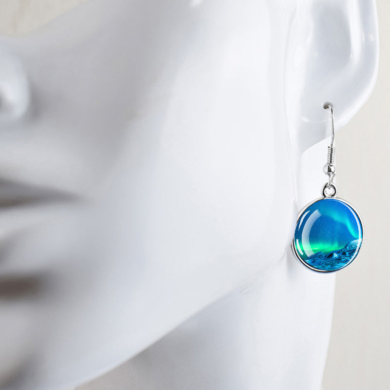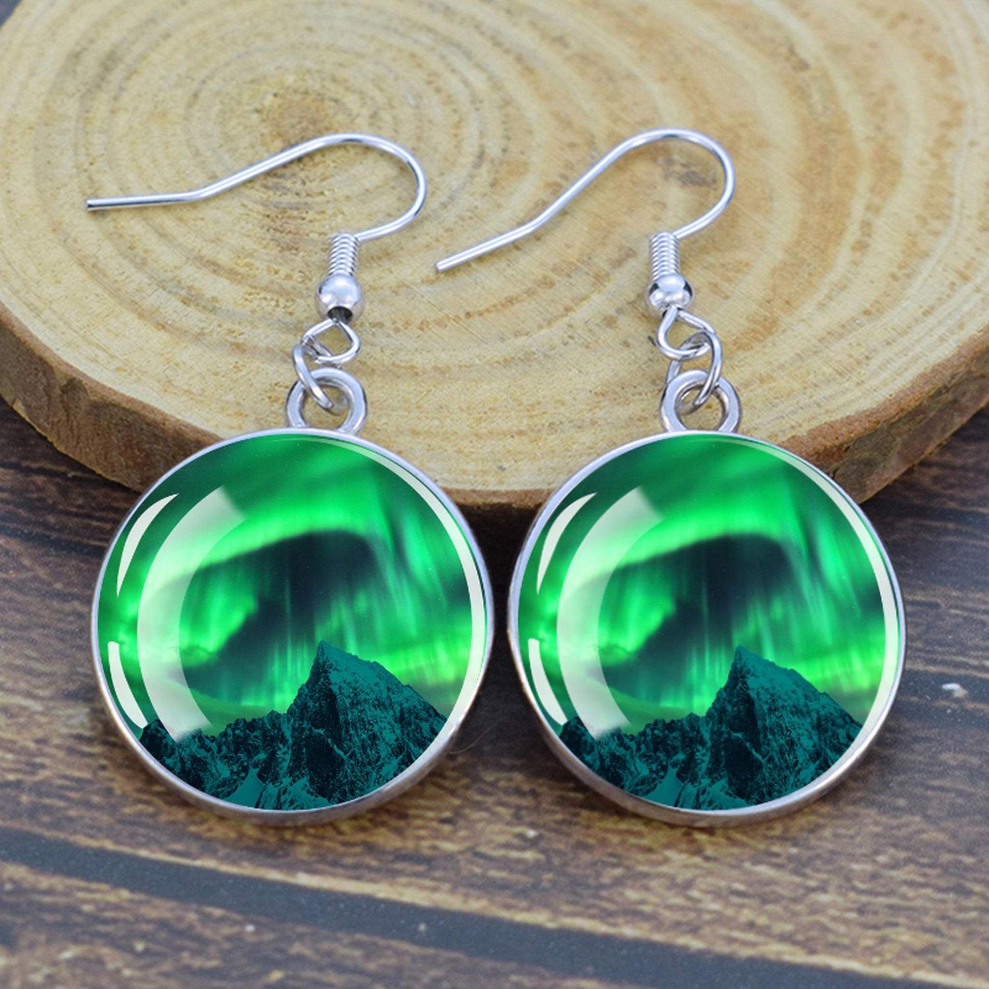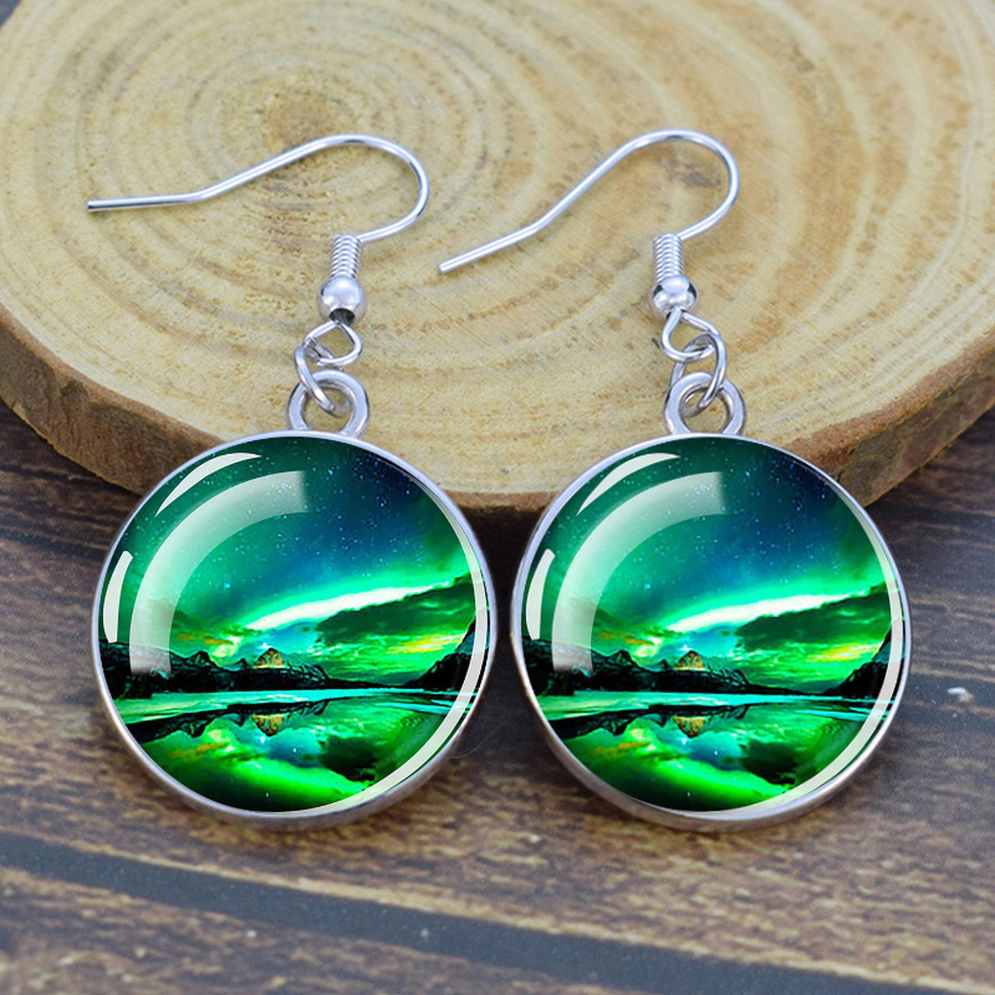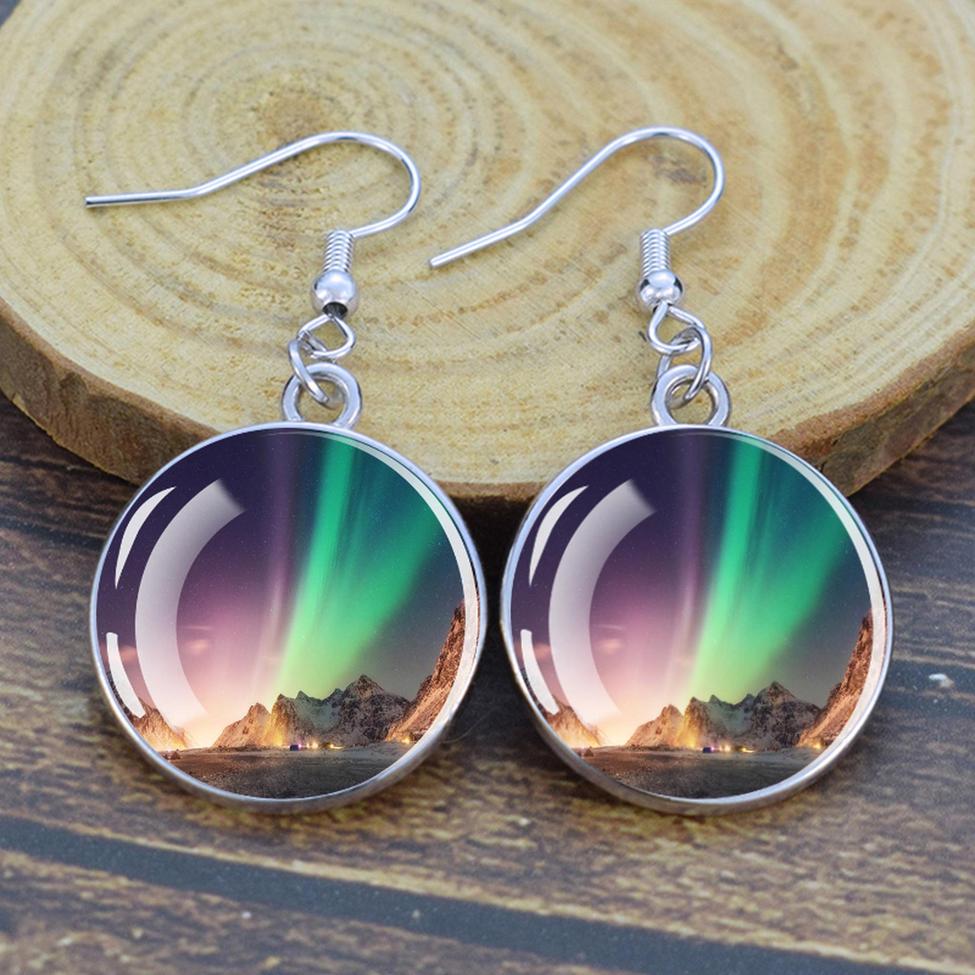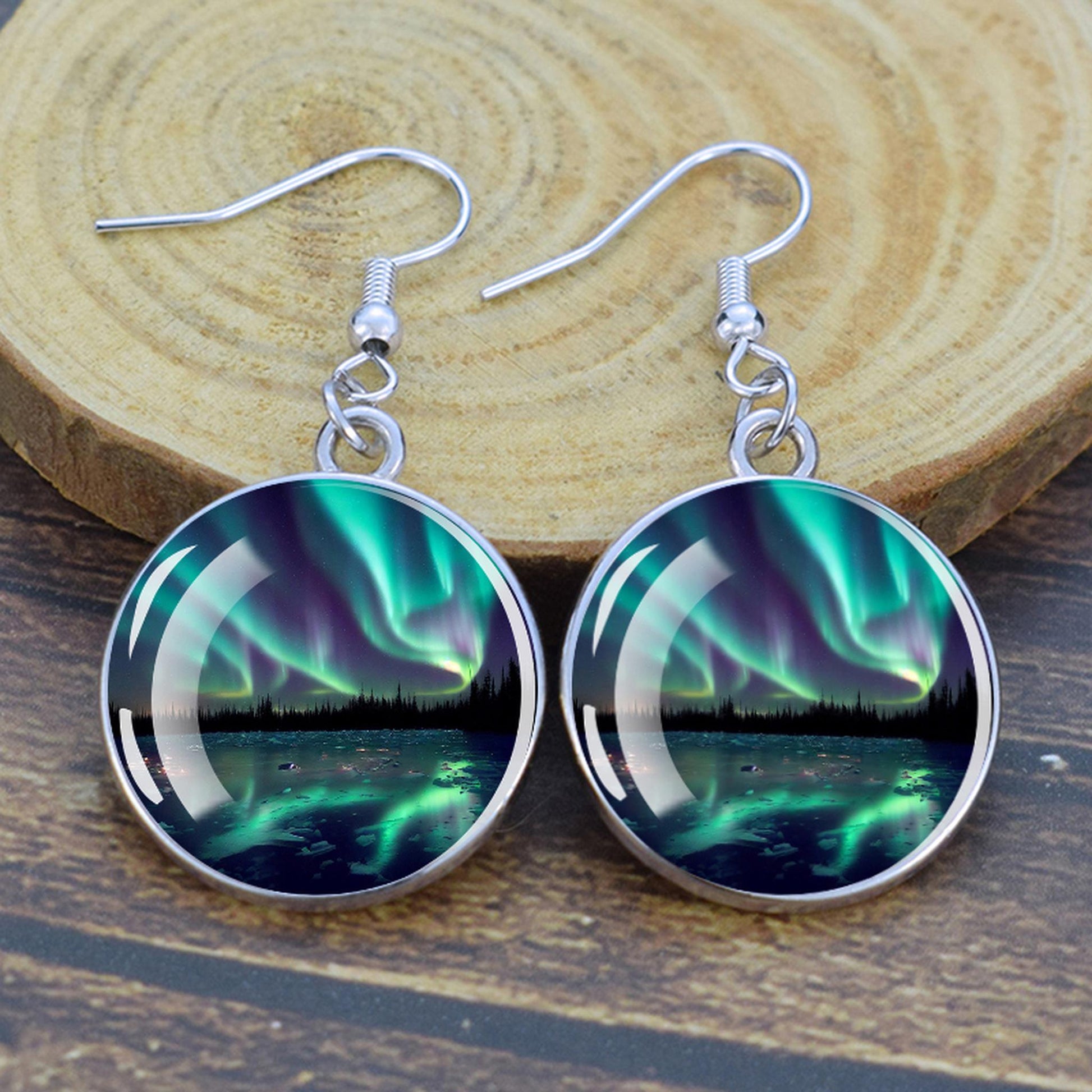 Diseñados para mujeres y niñas que aprecian el encanto de las maravillas de la naturaleza, estos aretes colgantes son una fusión de elegancia y mística. El delicado cabujón de cristal, con un generoso diámetro de 2,0 cm, actúa como lienzo para los encantadores tonos de la Aurora borreal. Sumérgete en el mágico juego de verdes, morados y azules, que recuerdan al propio espectáculo celestial.