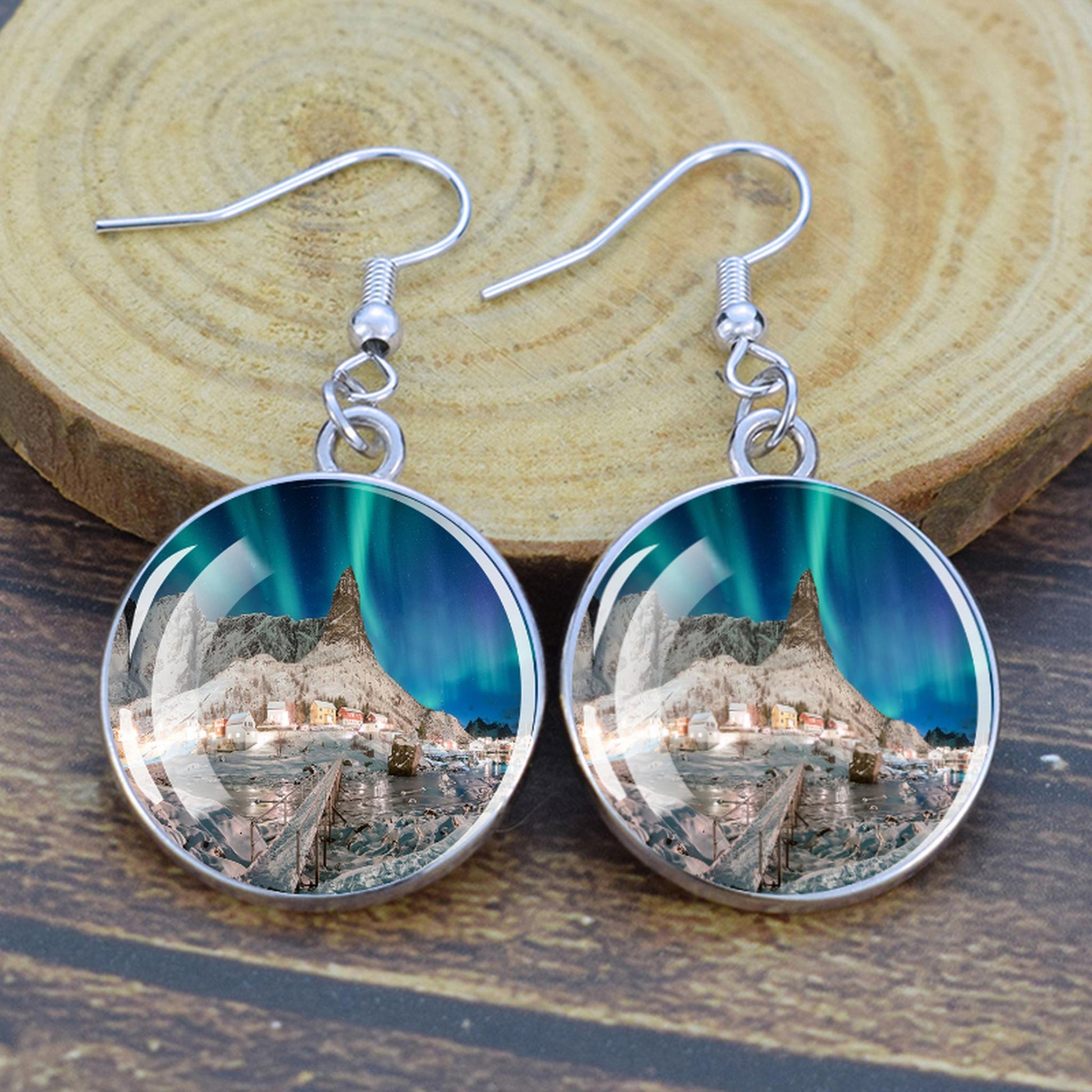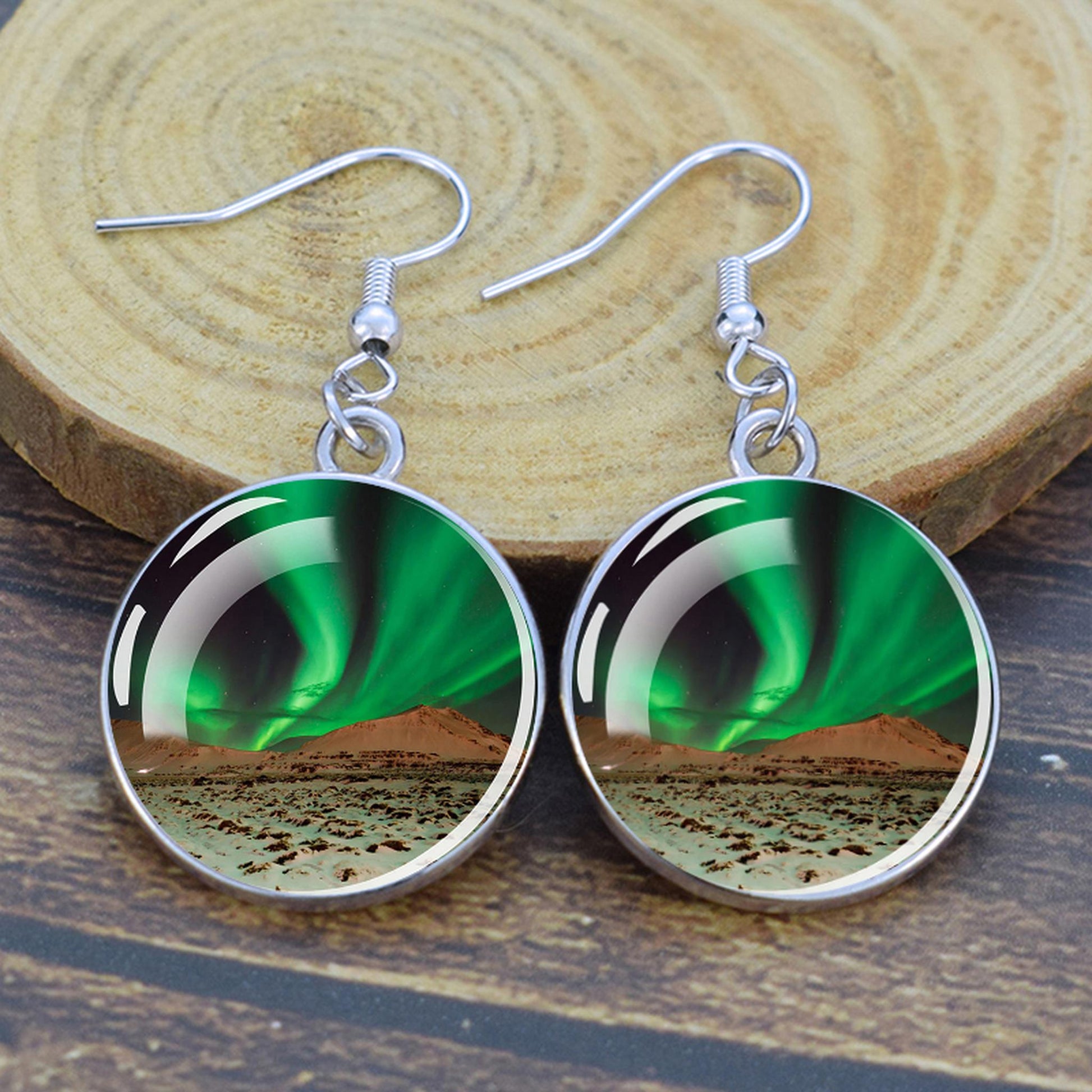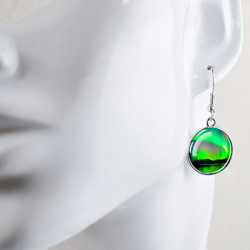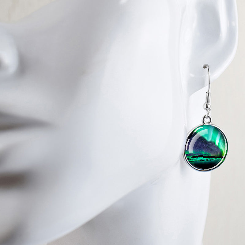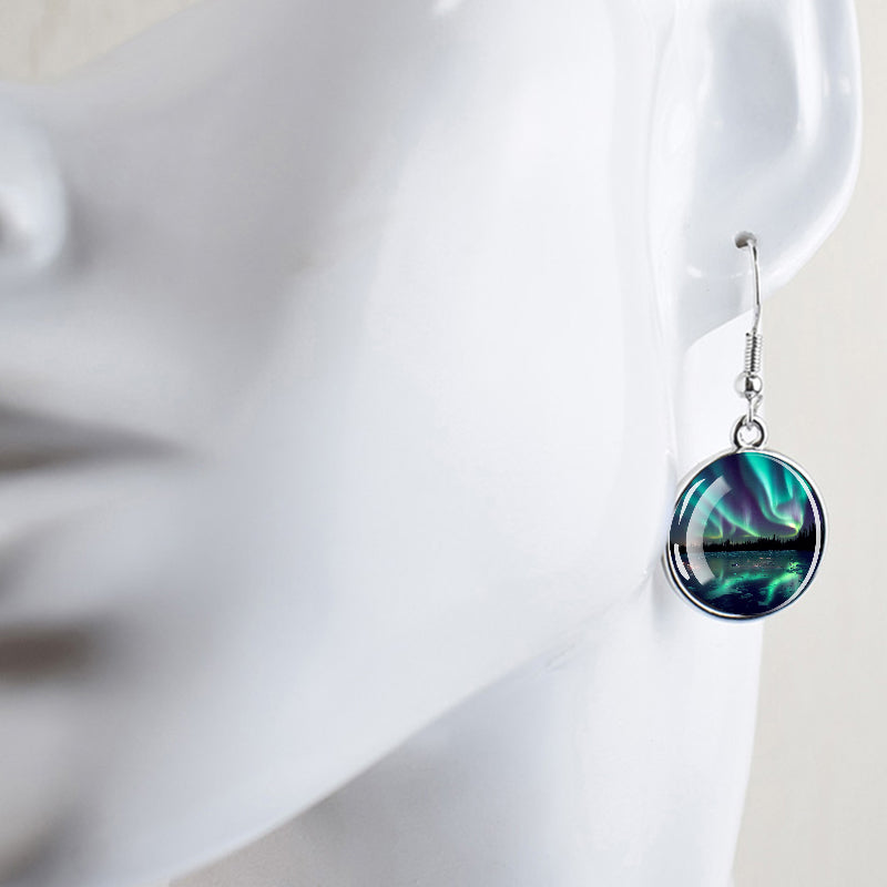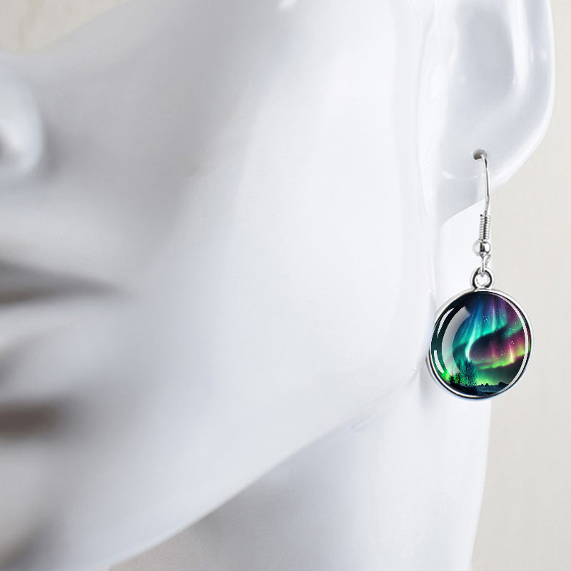 Diseñados para mujeres y niñas que aprecian el encanto de las maravillas de la naturaleza, estos aretes colgantes son una fusión de elegancia y mística. El delicado cabujón de cristal, con un generoso diámetro de 2,0 cm, actúa como lienzo para los encantadores tonos de la Aurora borreal. Sumérgete en el mágico juego de verdes, morados y azules, que recuerdan al propio espectáculo celestial.