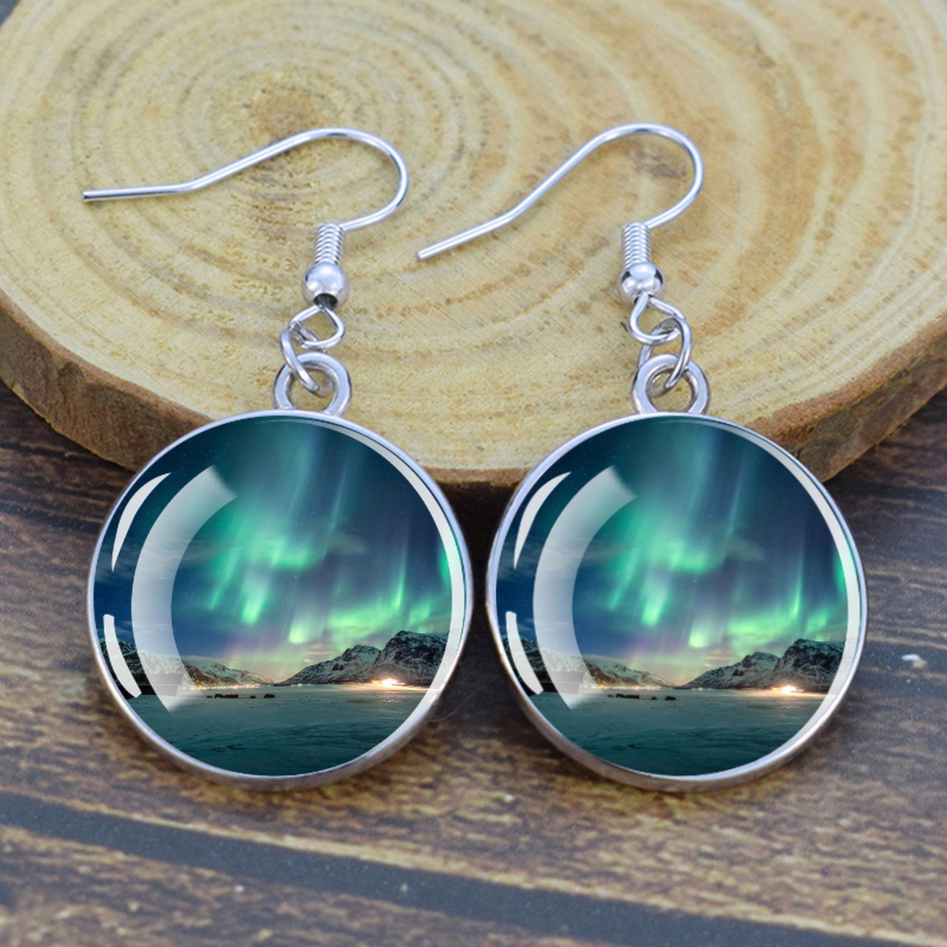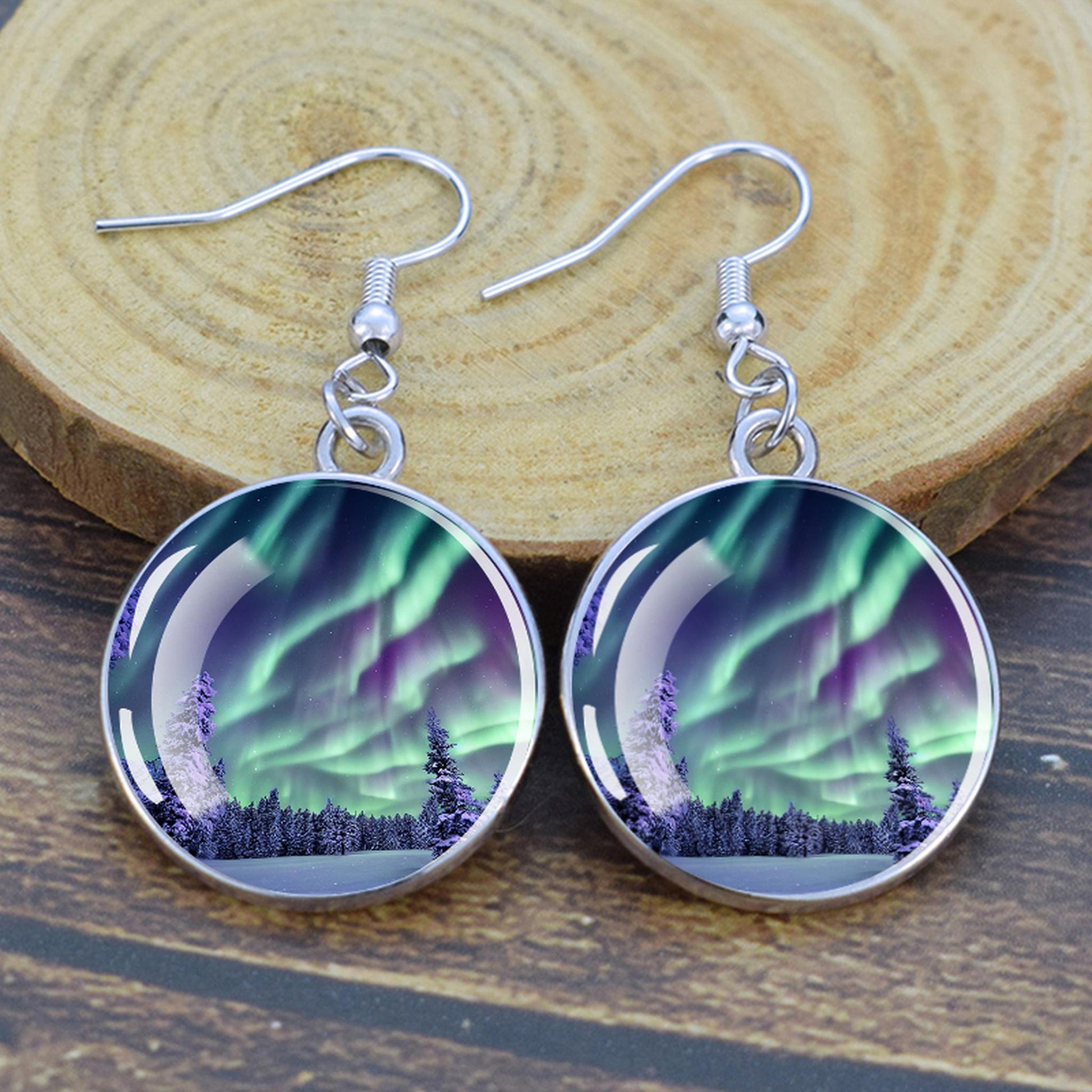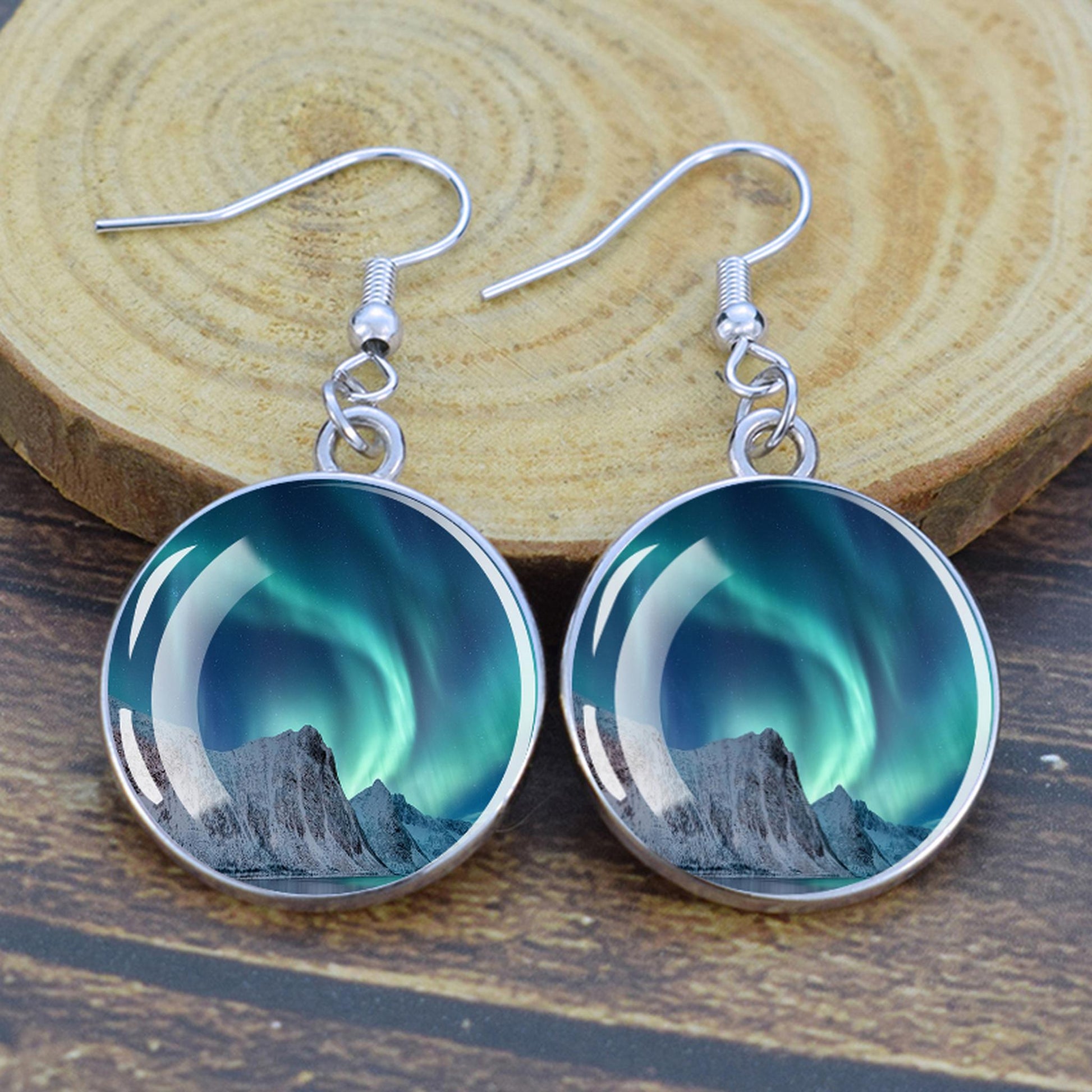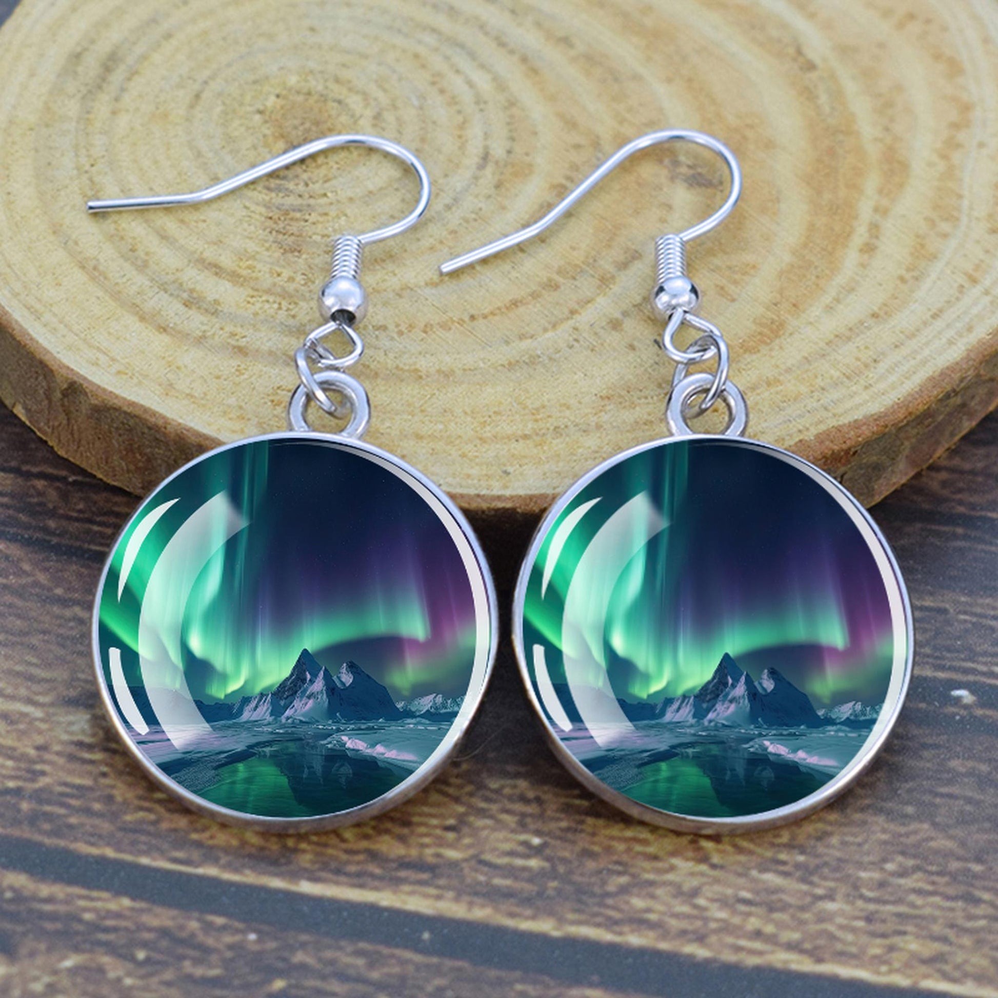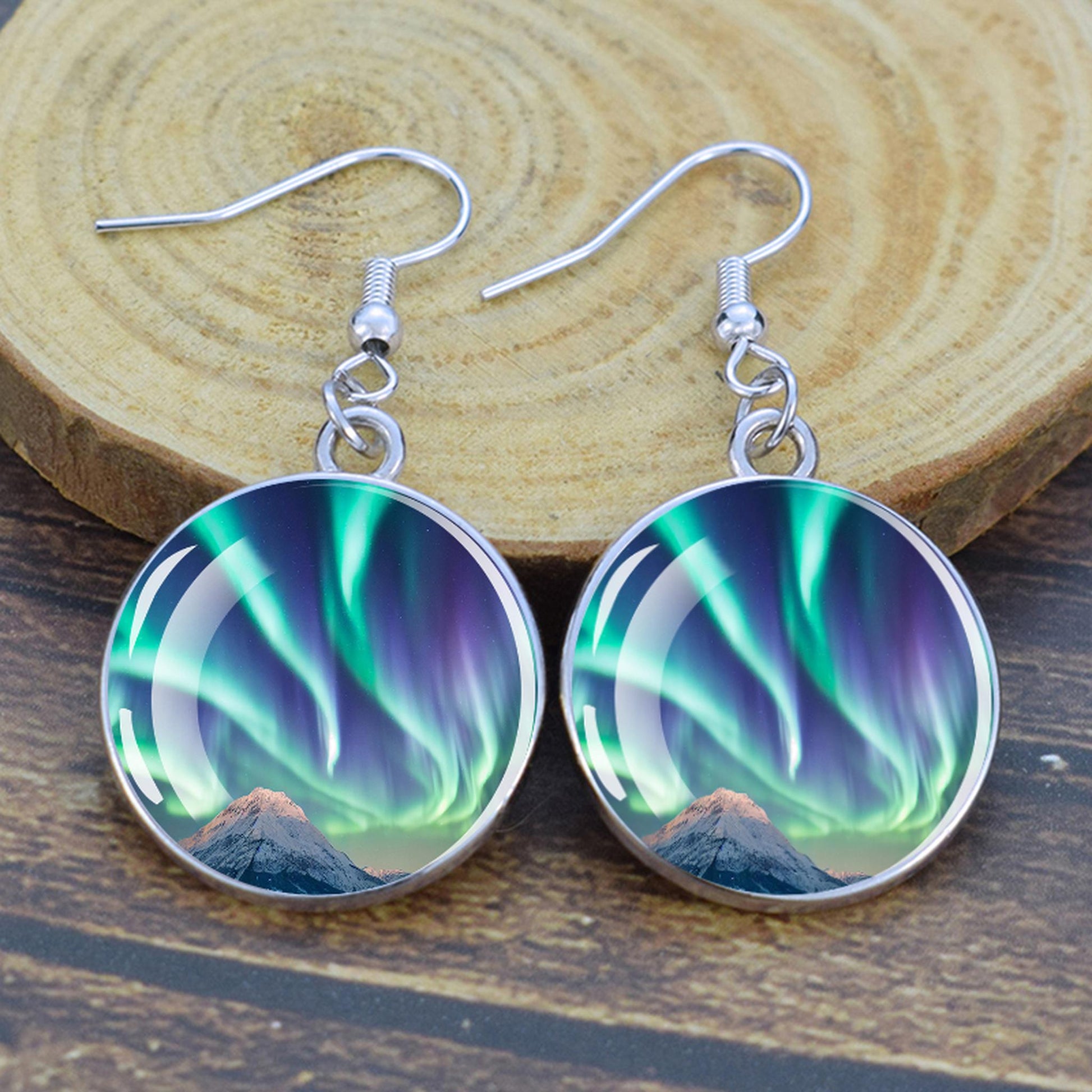 Conçues pour les femmes et les filles qui apprécient le charme des merveilles de la nature, ces boucles d'oreilles pendantes sont une fusion d'élégance et de mystique. Le délicat cabochon en verre, d'un diamètre généreux de 2,0 cm, sert de toile aux teintes enchanteresses des aurores boréales. Plongez-vous dans le jeu magique des verts, des violets et des bleus, rappelant le spectacle céleste lui-même.