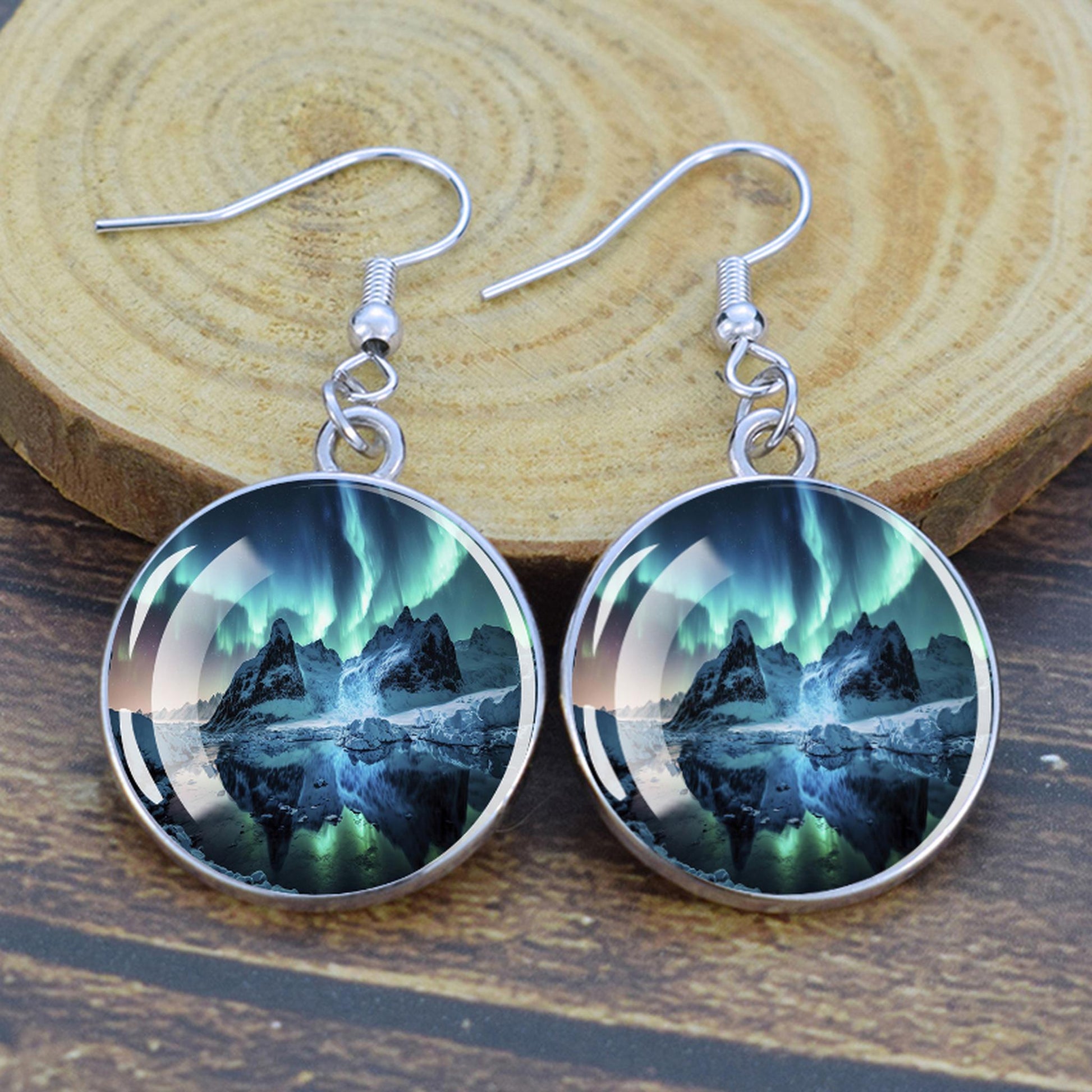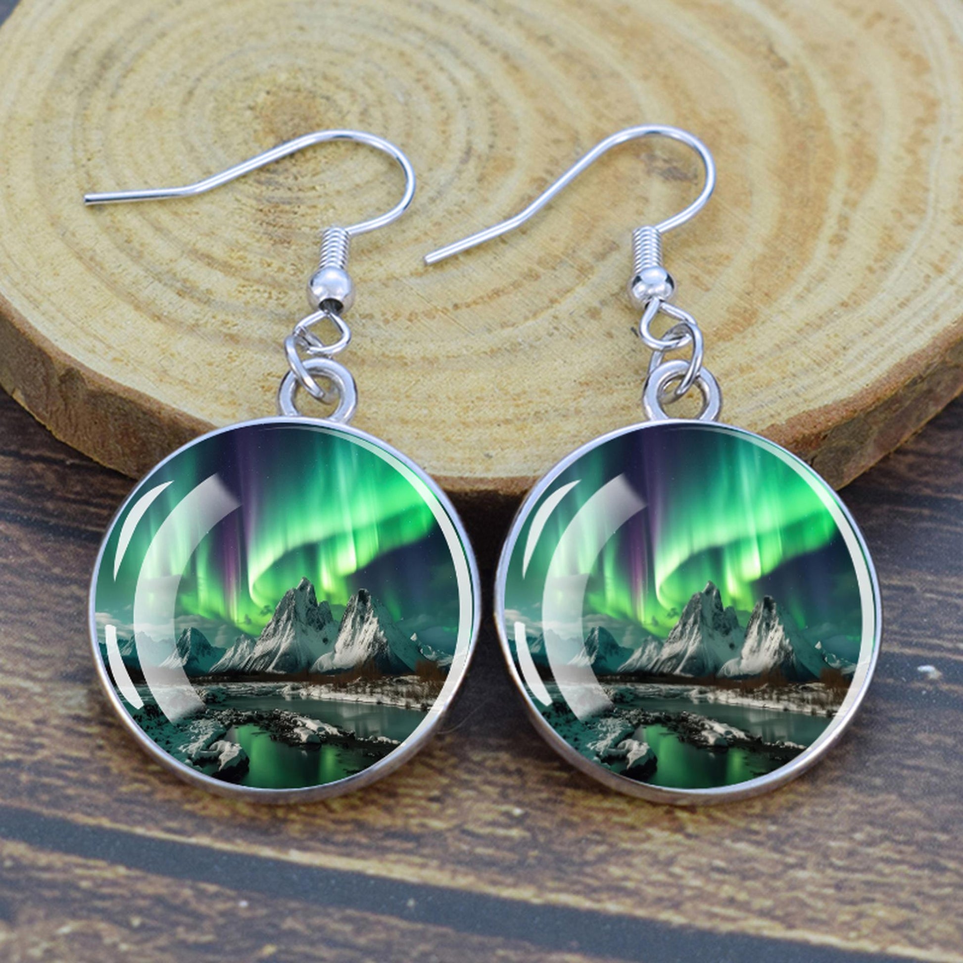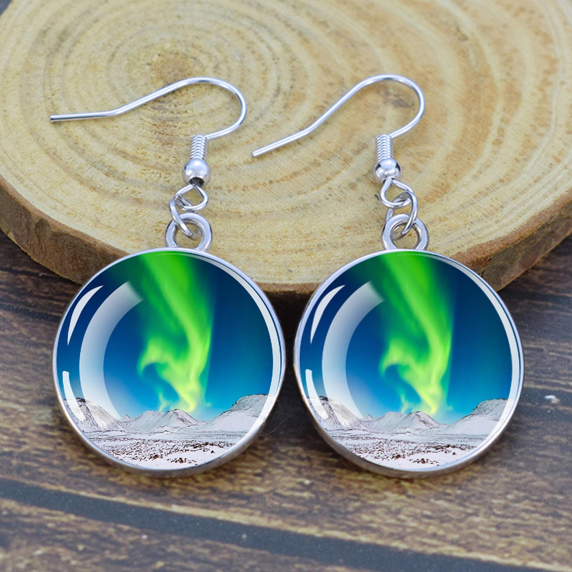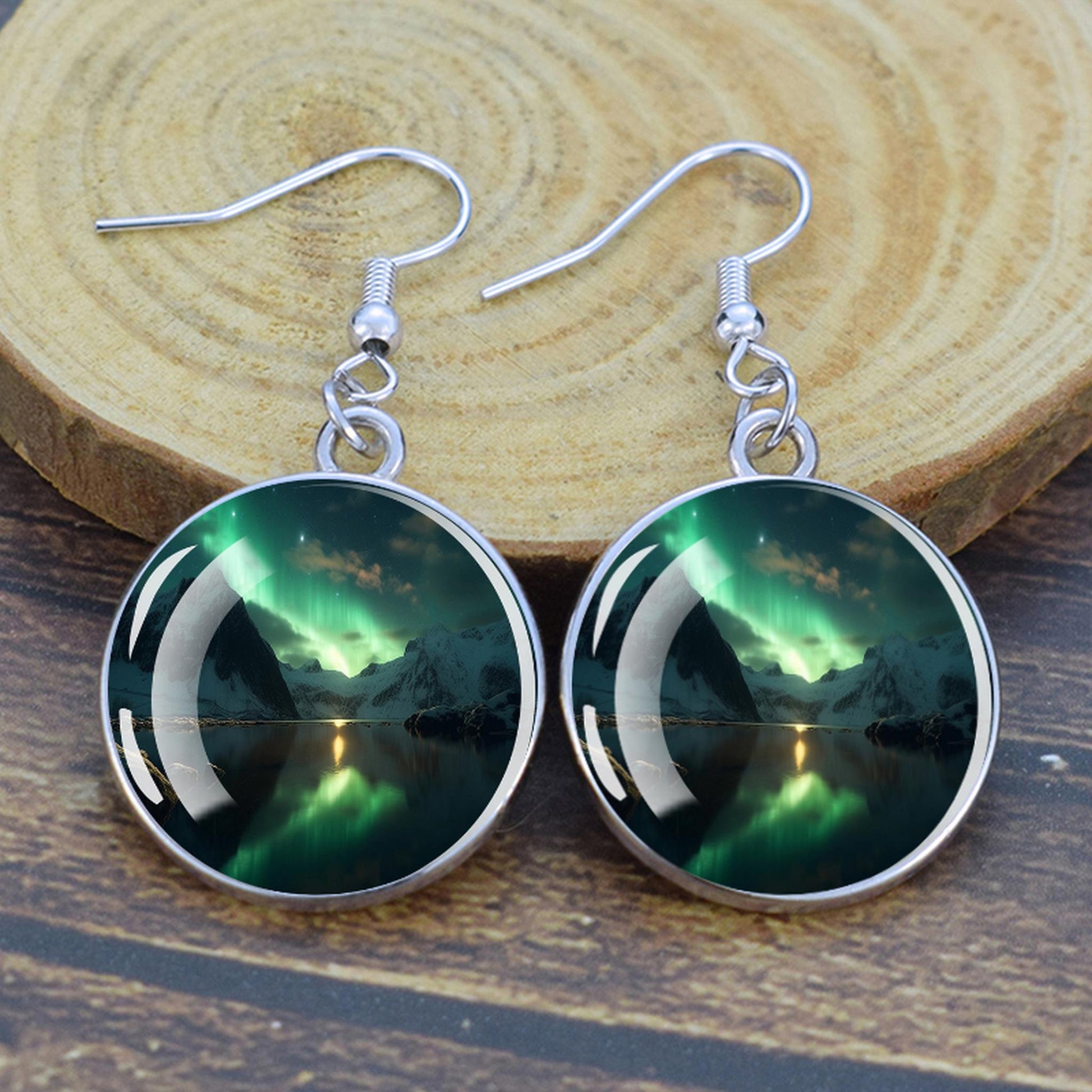 Conçues pour les femmes et les filles qui apprécient le charme des merveilles de la nature, ces boucles d'oreilles pendantes sont une fusion d'élégance et de mystique. Le délicat cabochon en verre, d'un diamètre généreux de 2,0 cm, sert de toile aux teintes enchanteresses des aurores boréales. Plongez-vous dans le jeu magique des verts, des violets et des bleus, rappelant le spectacle céleste lui-même.