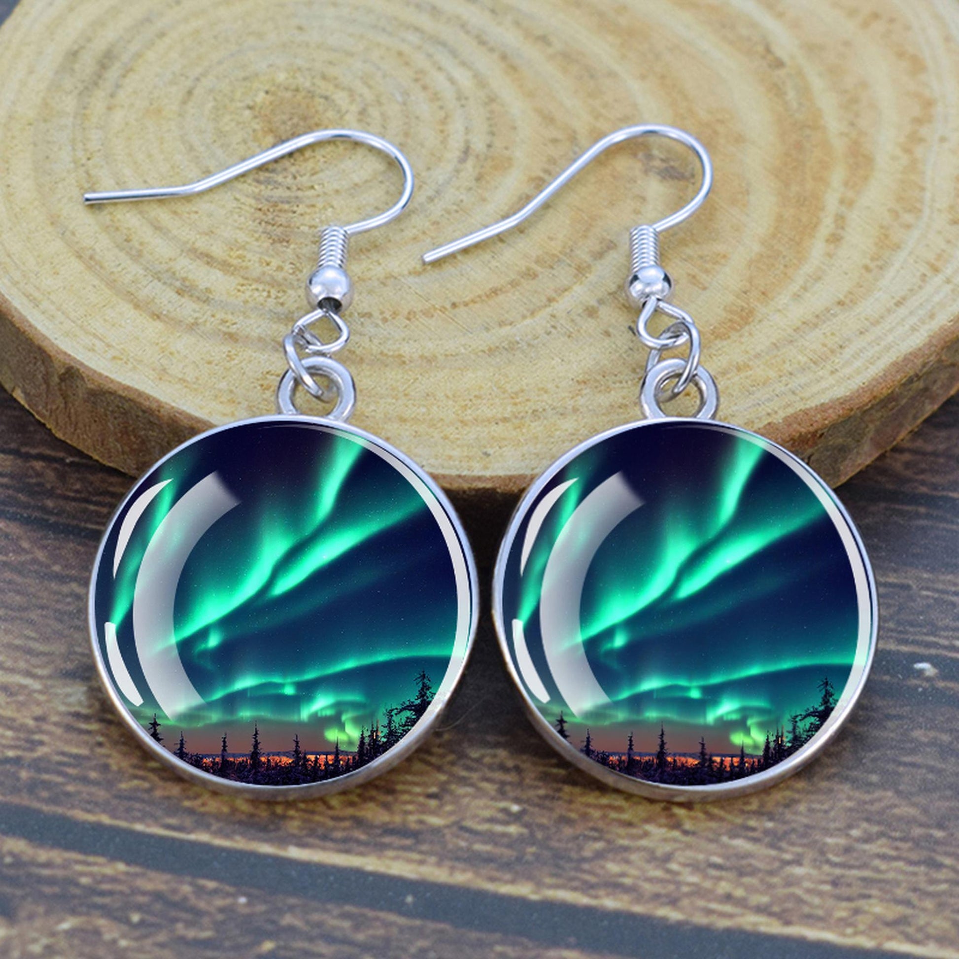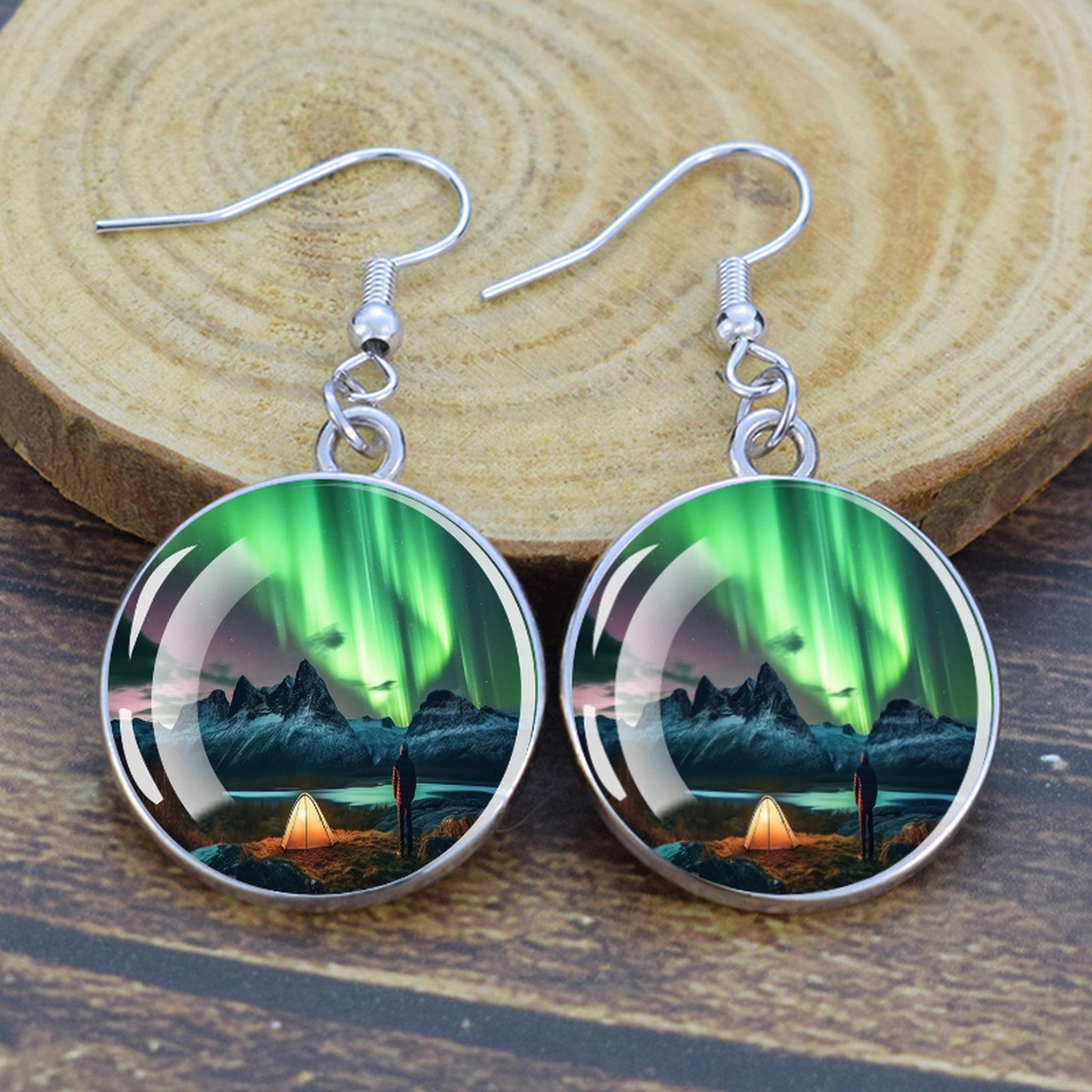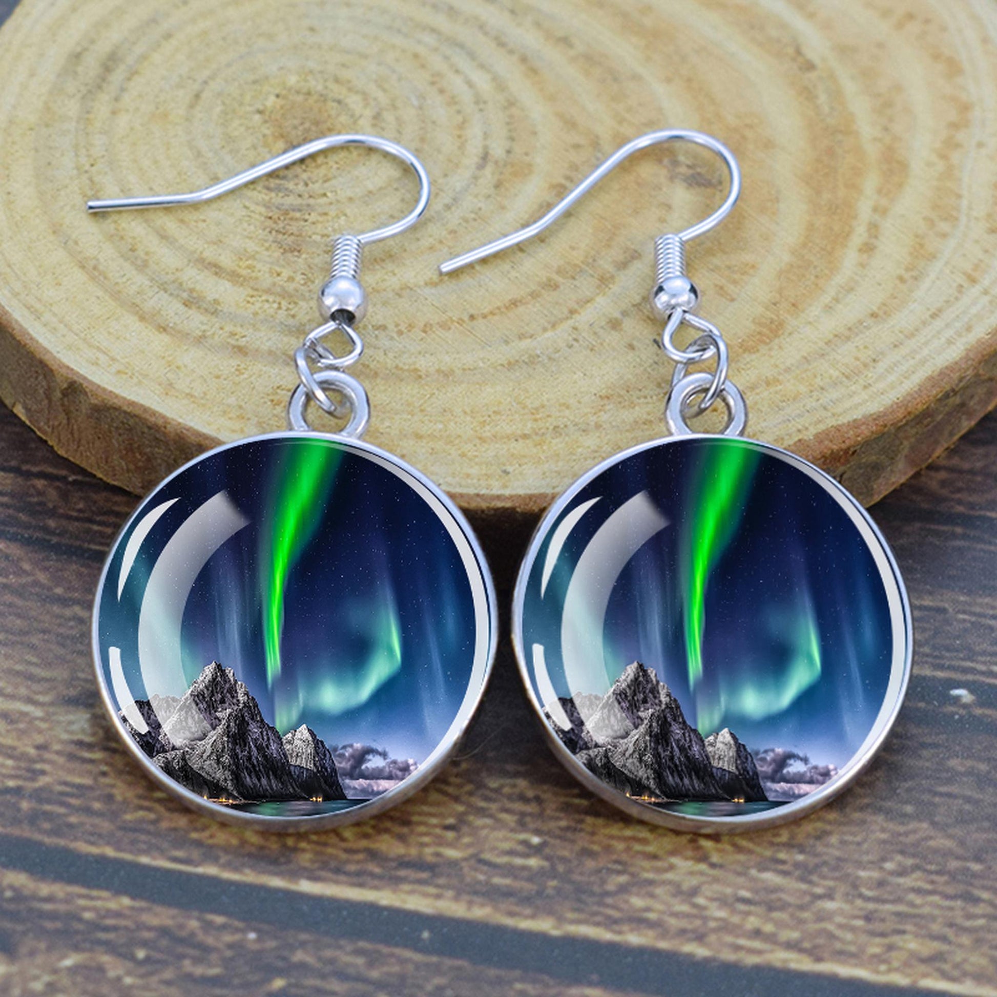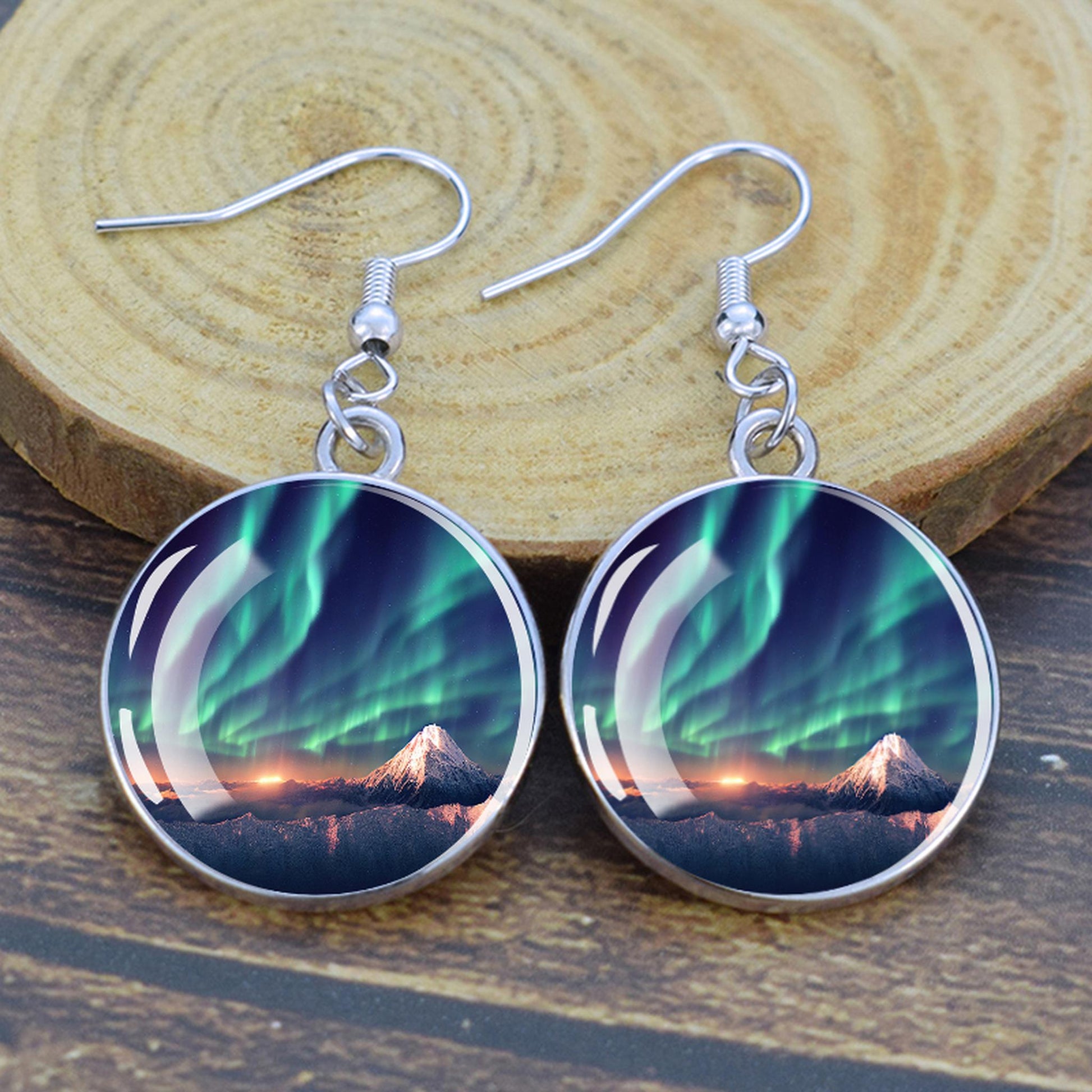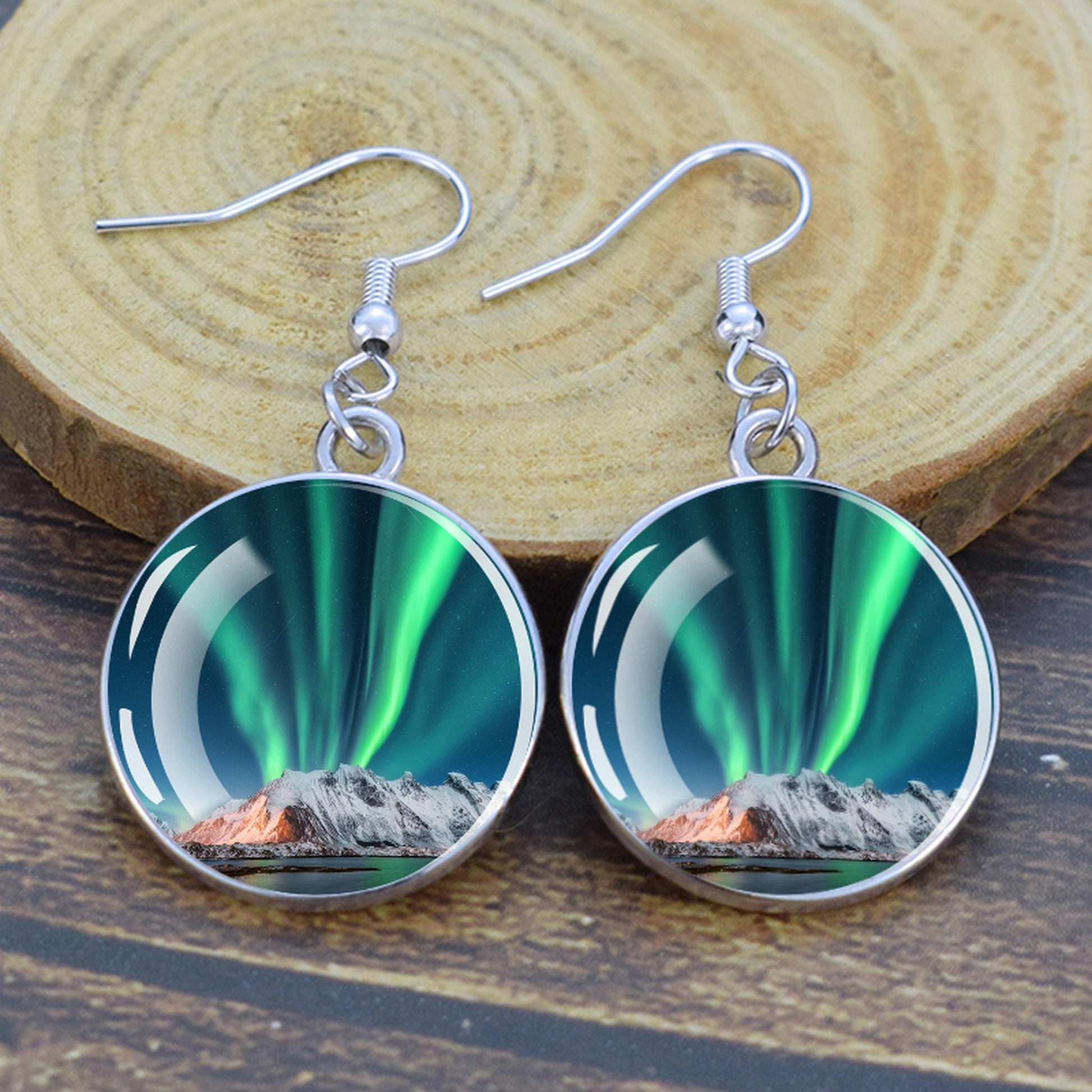 Conçues pour les femmes et les filles qui apprécient le charme des merveilles de la nature, ces boucles d'oreilles pendantes sont une fusion d'élégance et de mystique. Le délicat cabochon en verre, d'un diamètre généreux de 2,0 cm, sert de toile aux teintes enchanteresses des aurores boréales. Plongez-vous dans le jeu magique des verts, des violets et des bleus, rappelant le spectacle céleste lui-même.