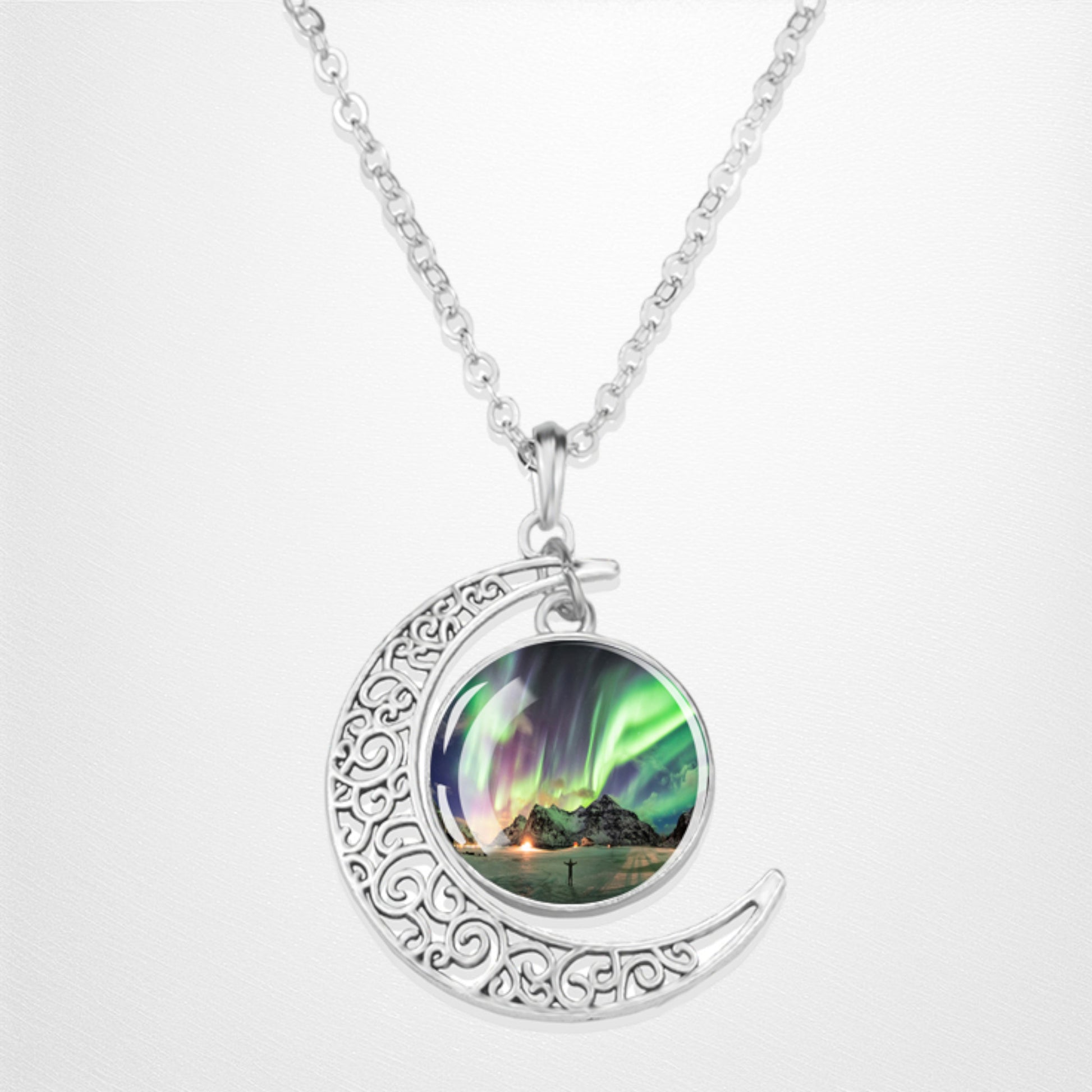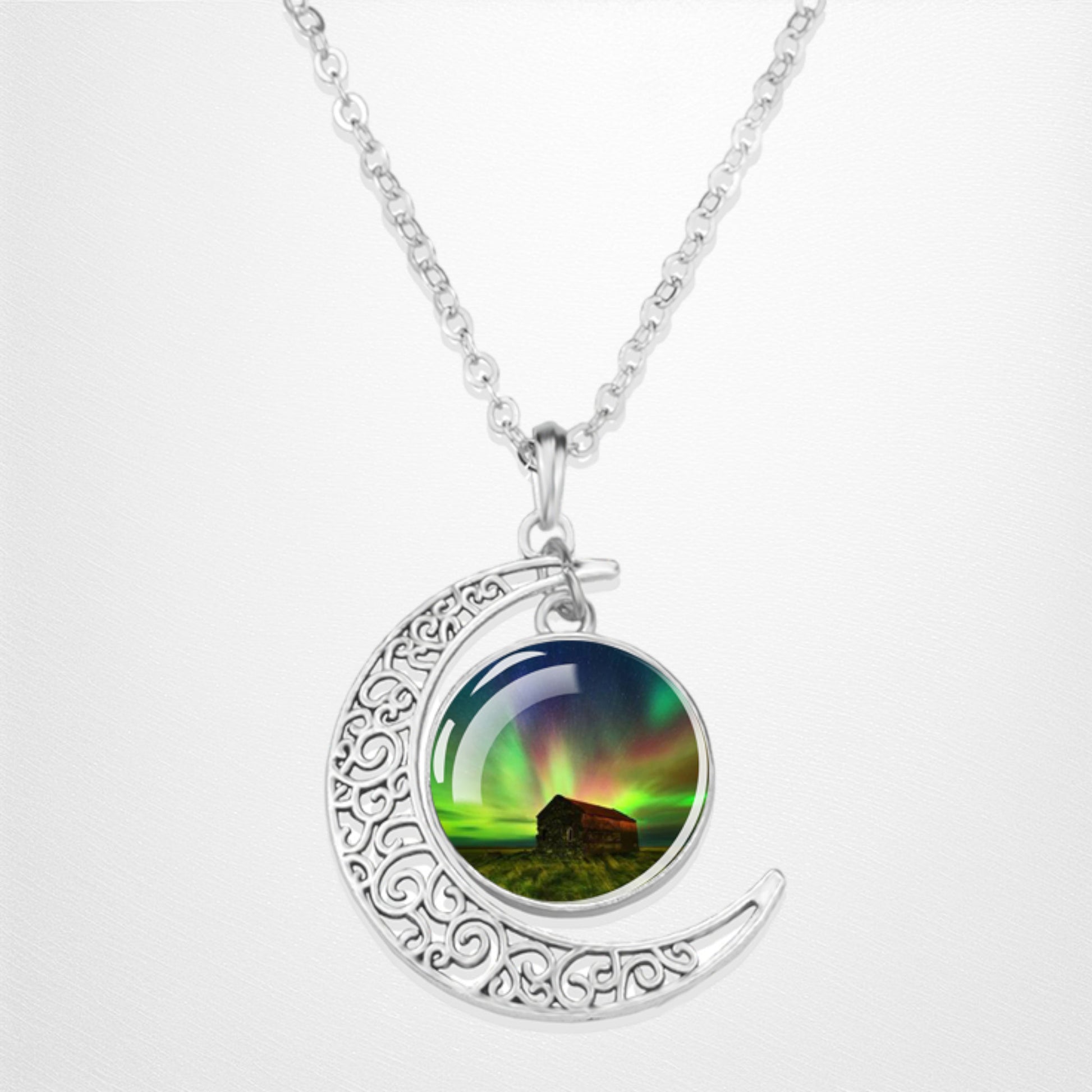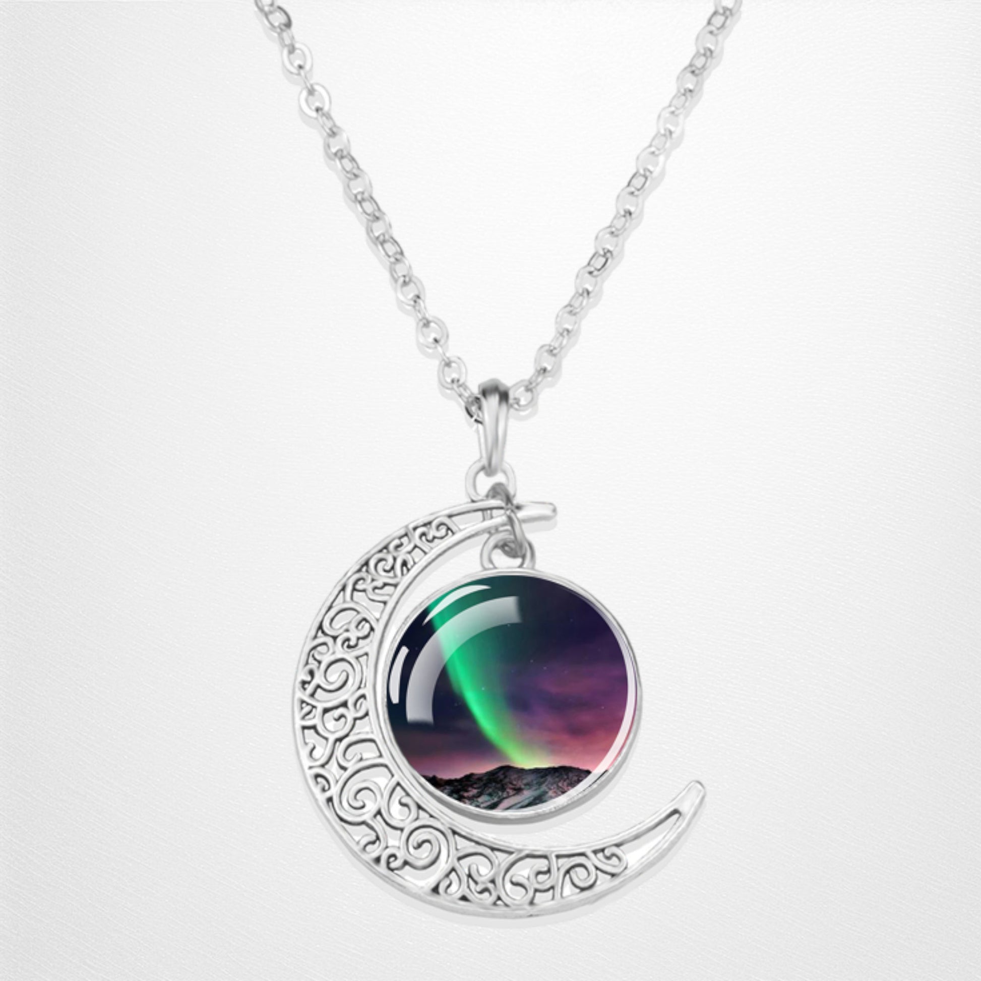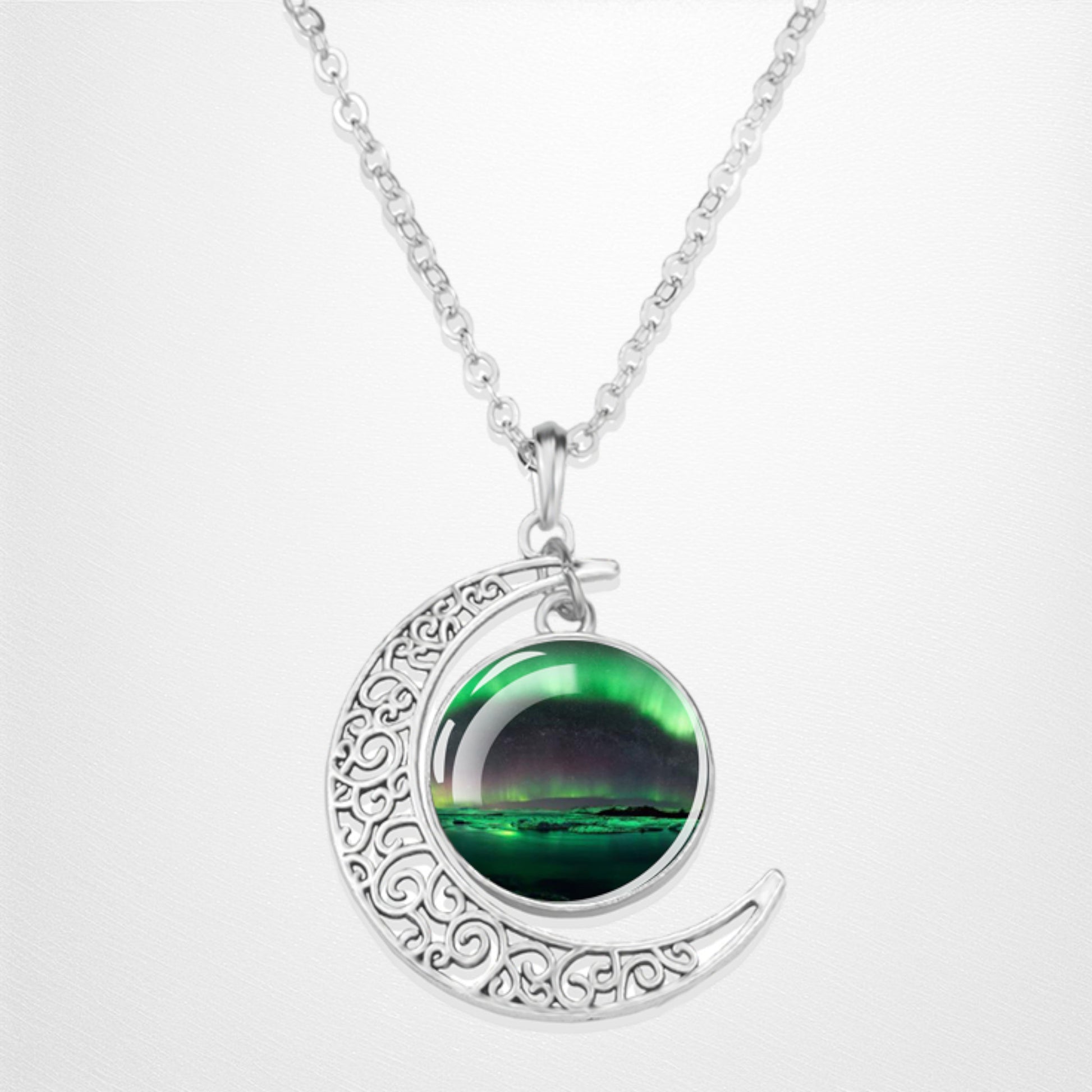 Luminous Aurora Borealis Crescent Necklace- Northern Light Jewelry - Unique Crescent Glass Cabochon Pendent Necklace - Perfect Aurora Lovers Gift