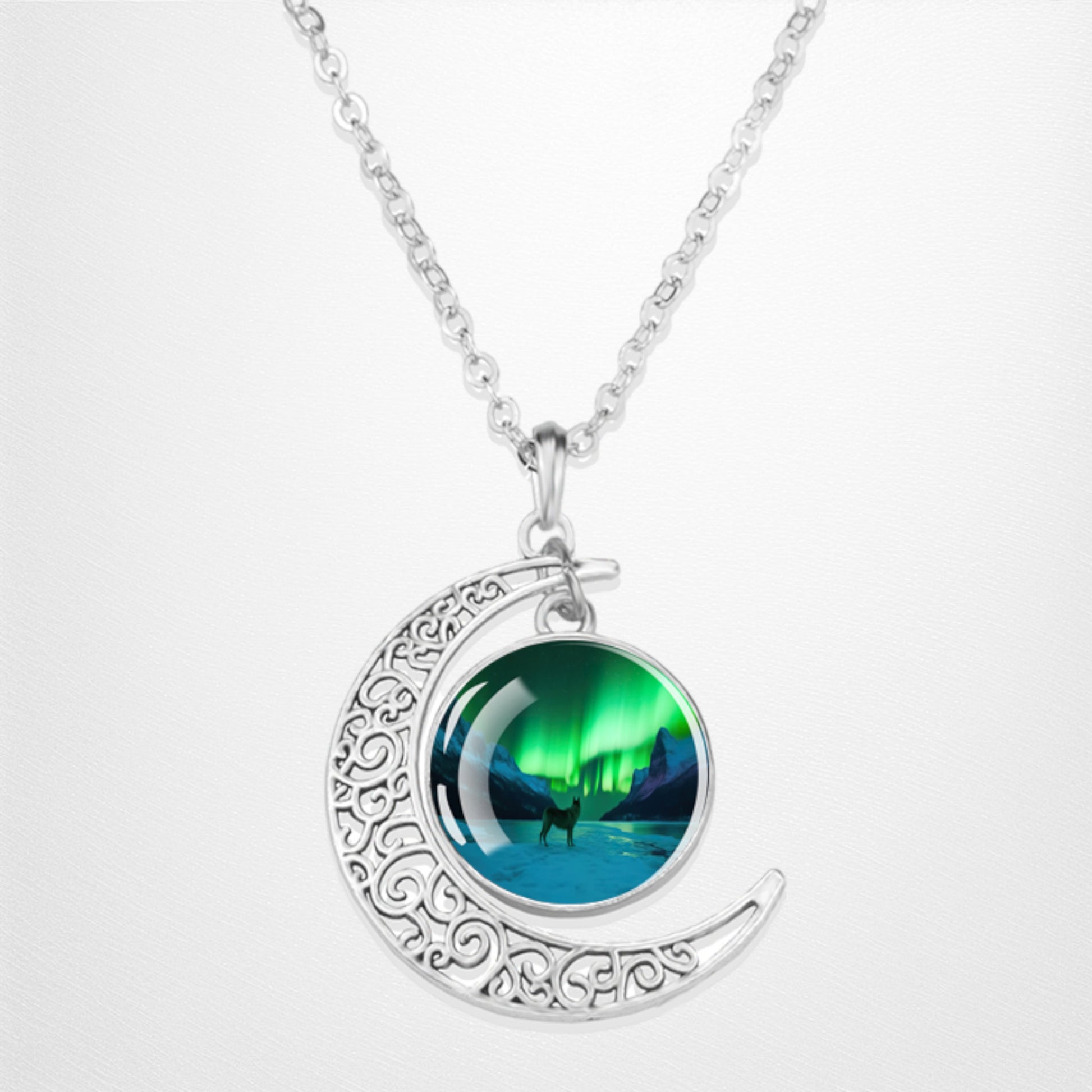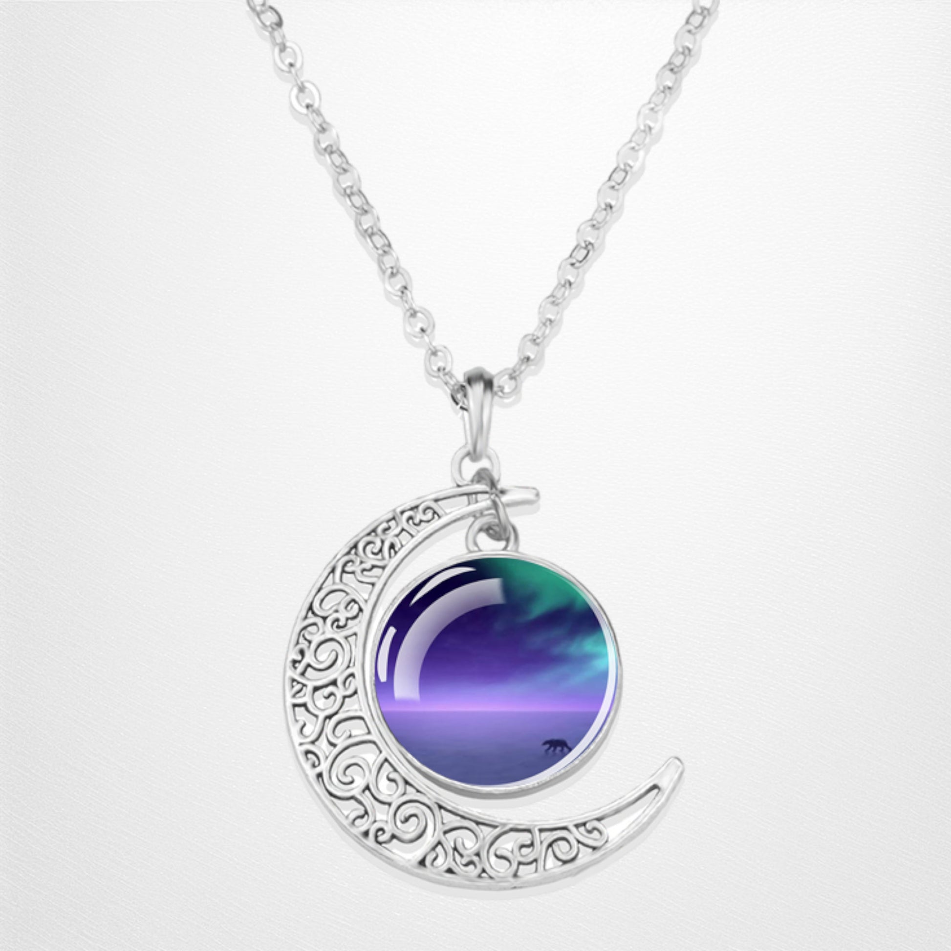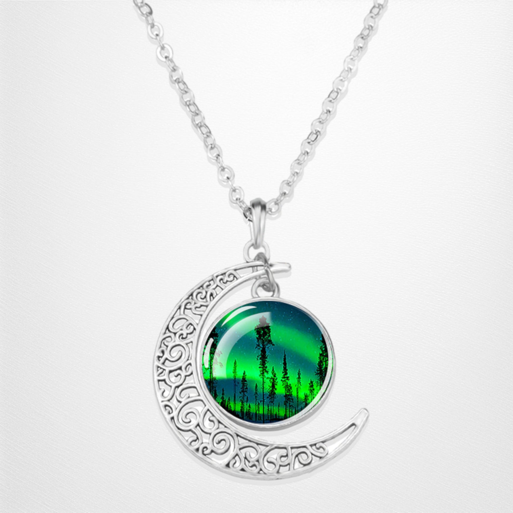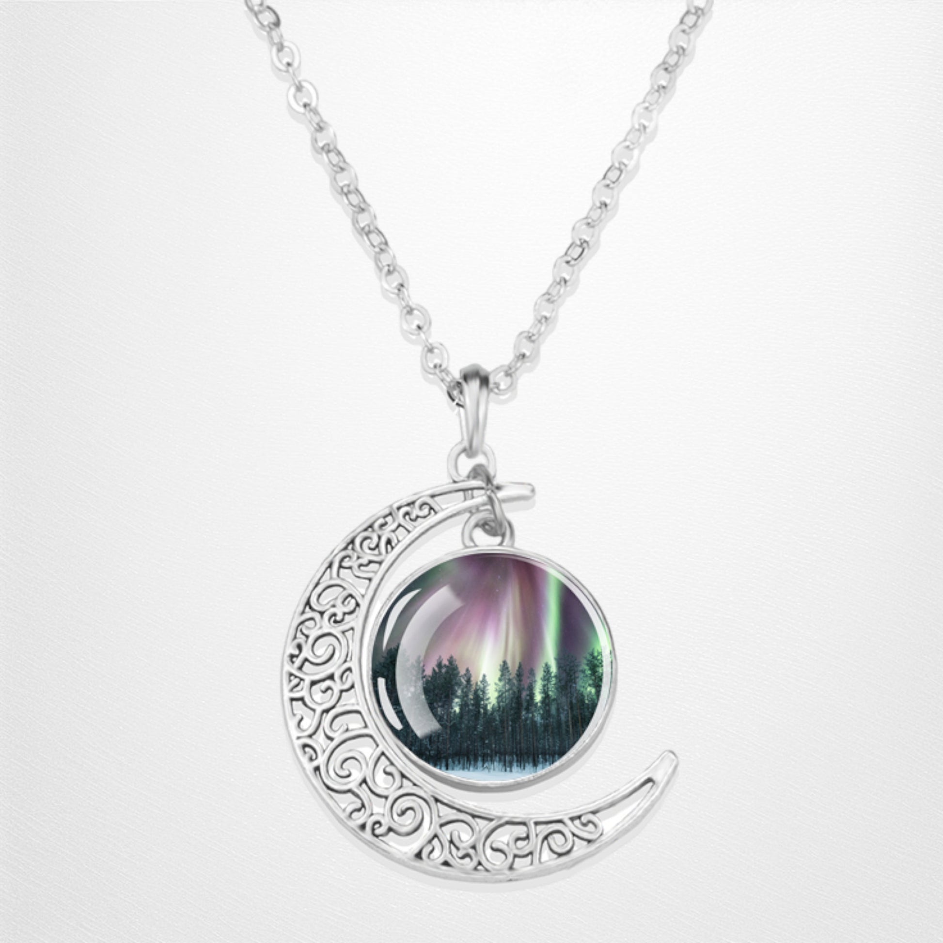 Luminous Aurora Borealis Crescent Necklace- Northern Light Jewelry - Unique Crescent Glass Cabochon Pendent Necklace - Perfect Aurora Lovers Gift