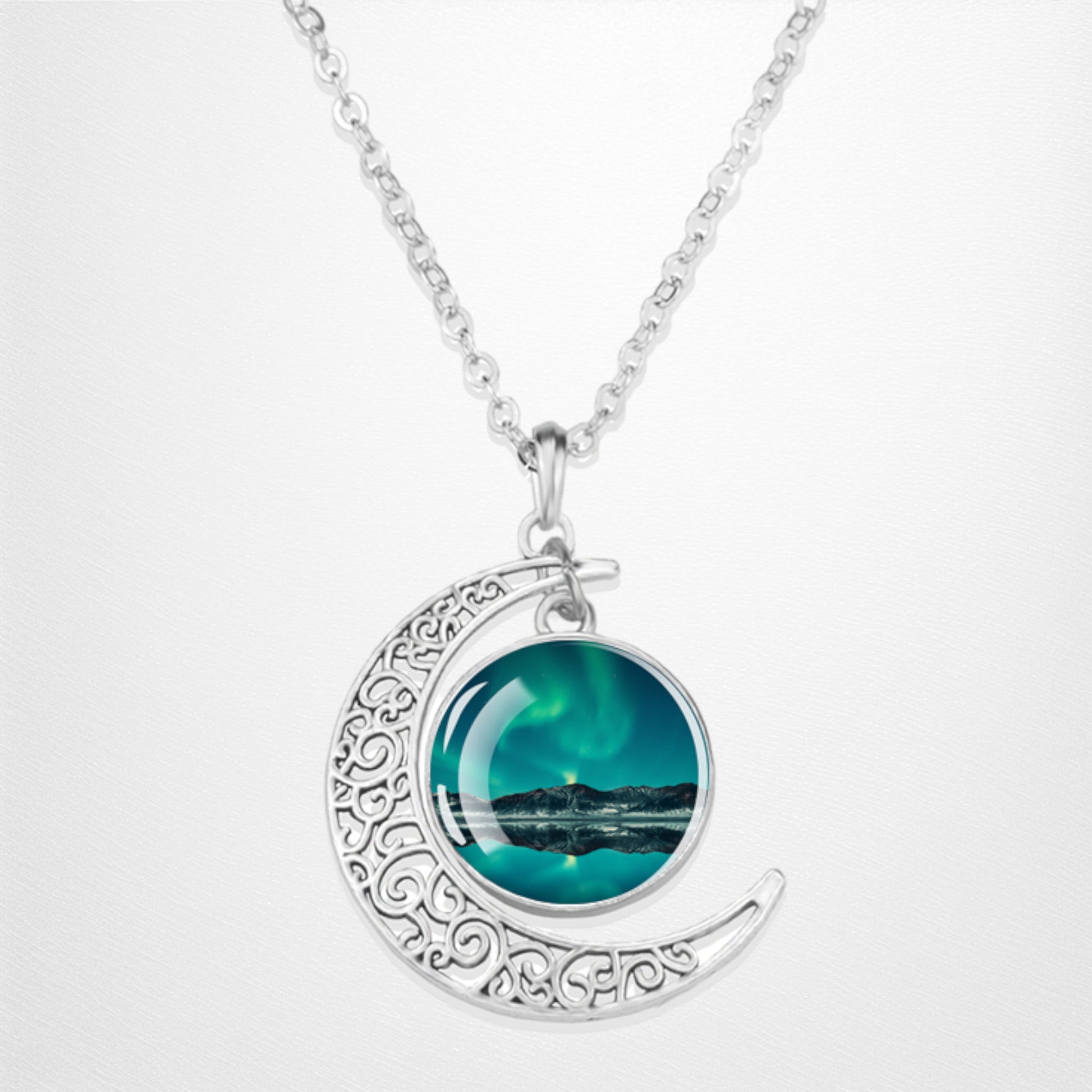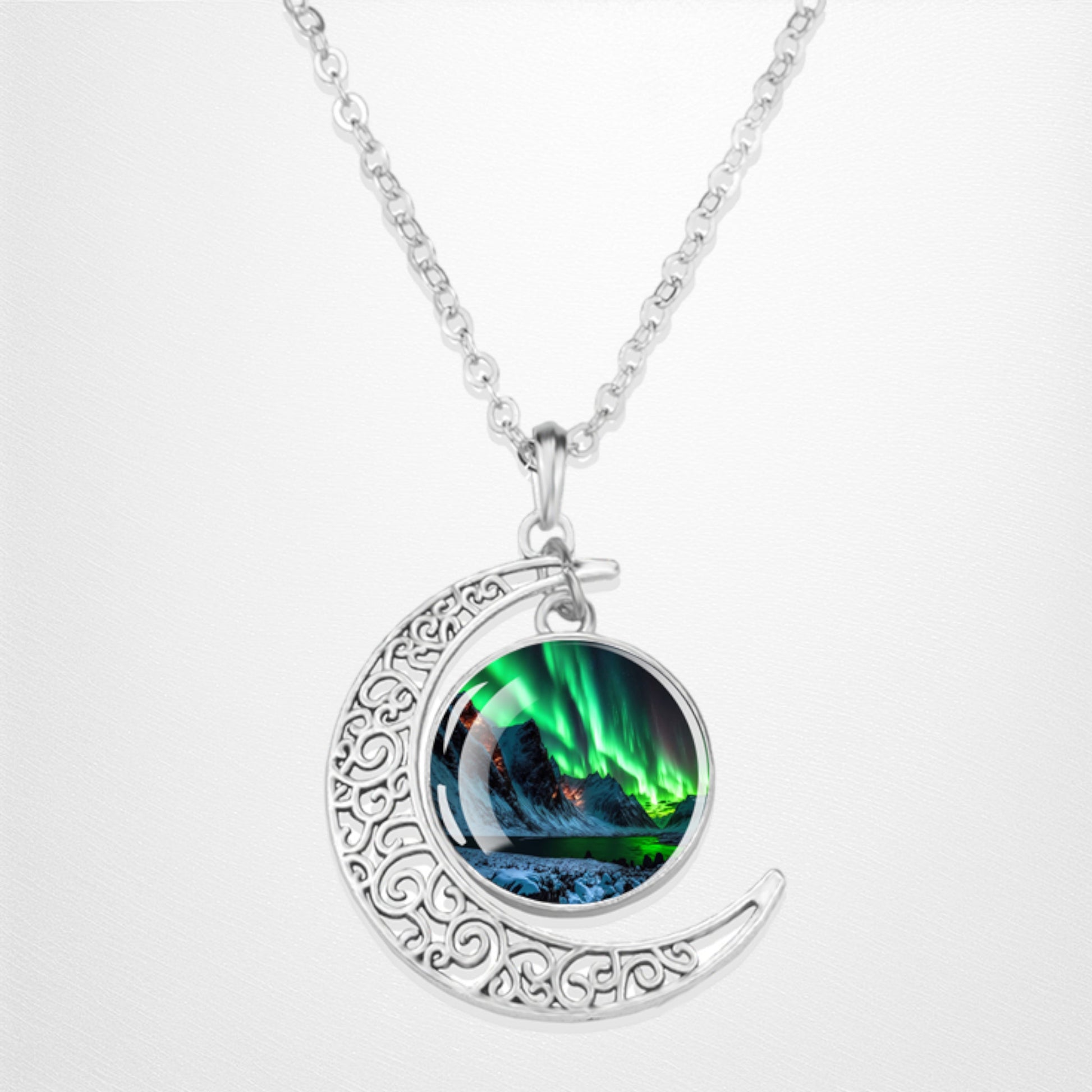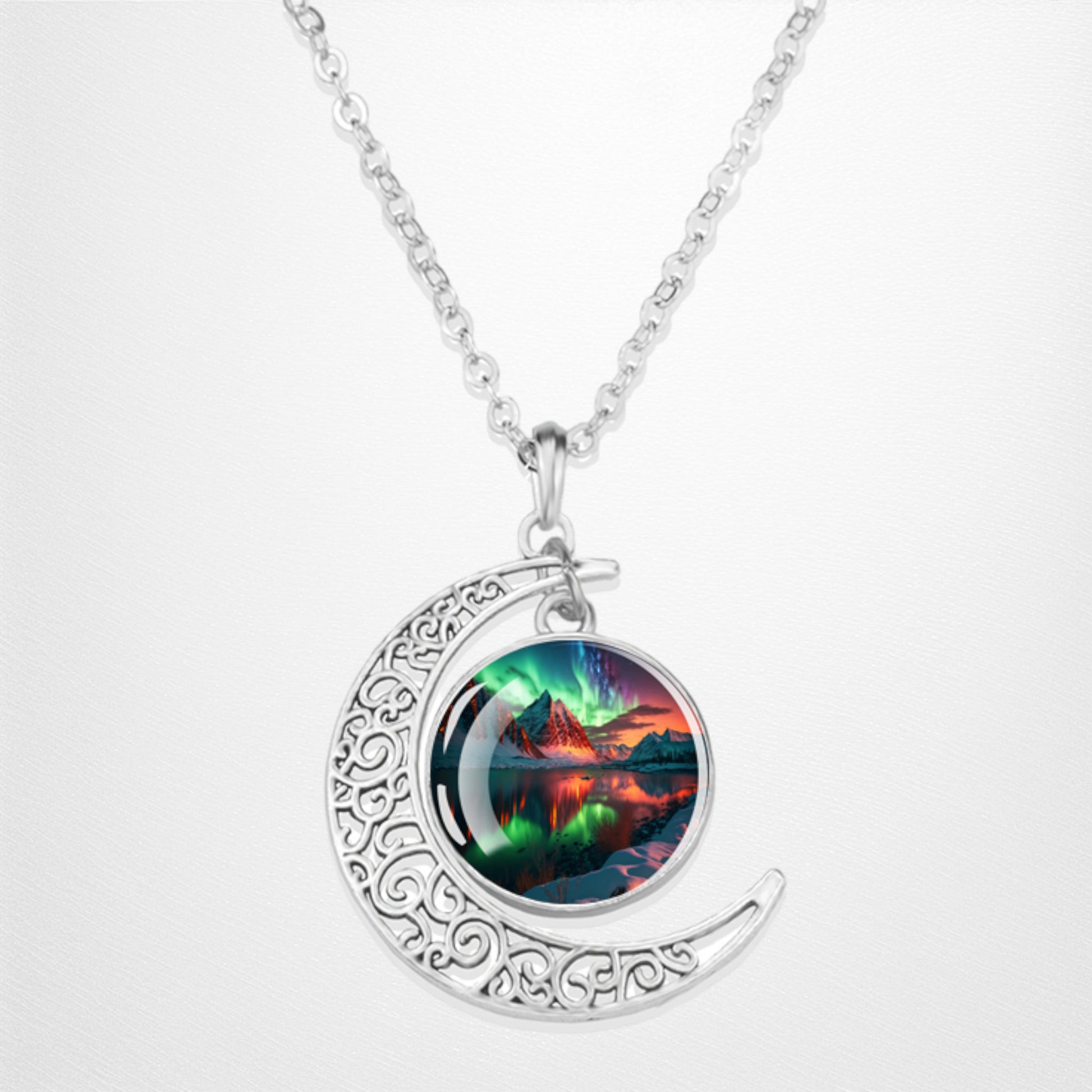 Adorn your neckline with the celestial charm of the Luminous Aurora Borealis Crescent Necklace. This exquisite piece of Northern Light Jewelry encapsulates the ethereal allure of the auroras in a Crescent Glass Cabochon pendant, making it the perfect gift for Aurora lovers.