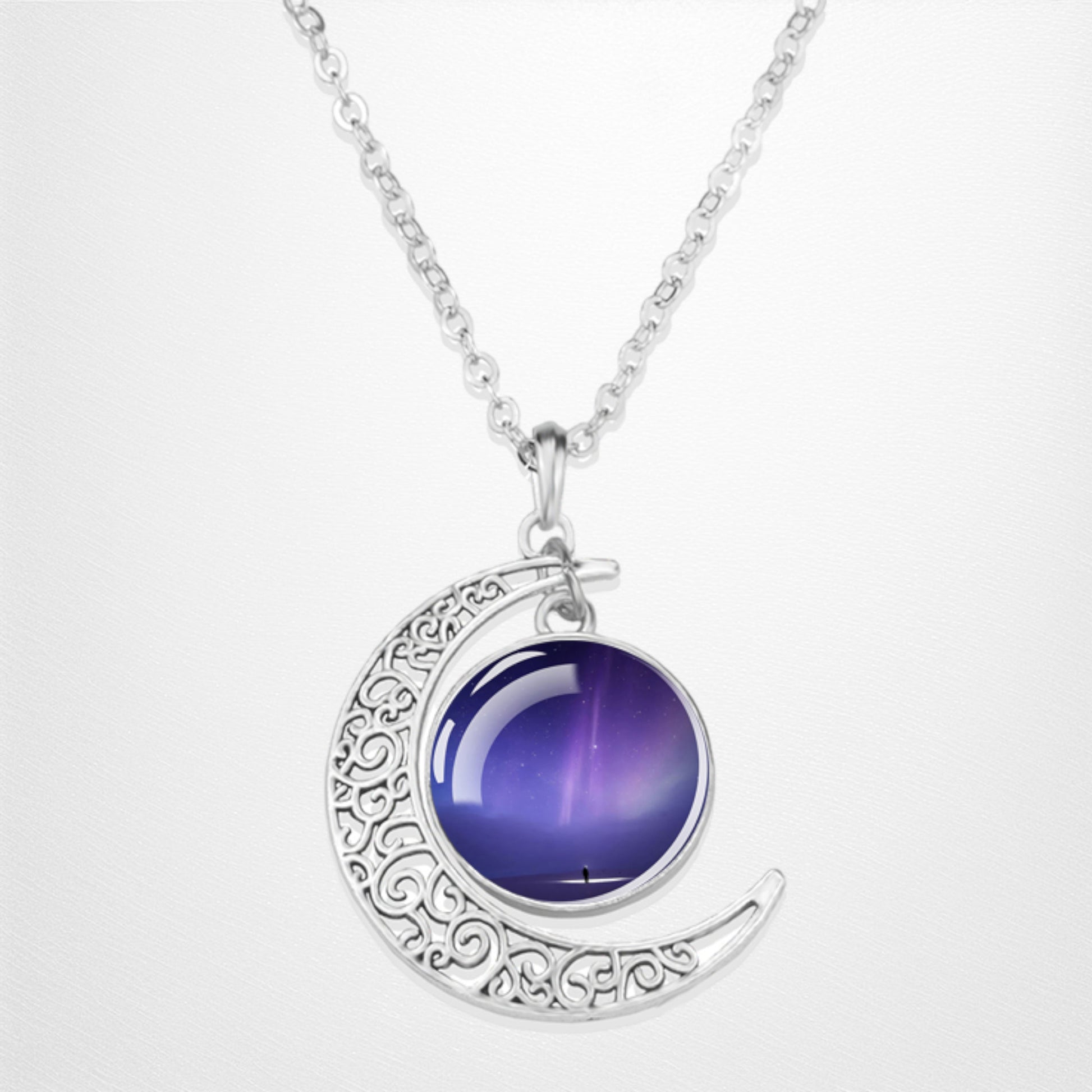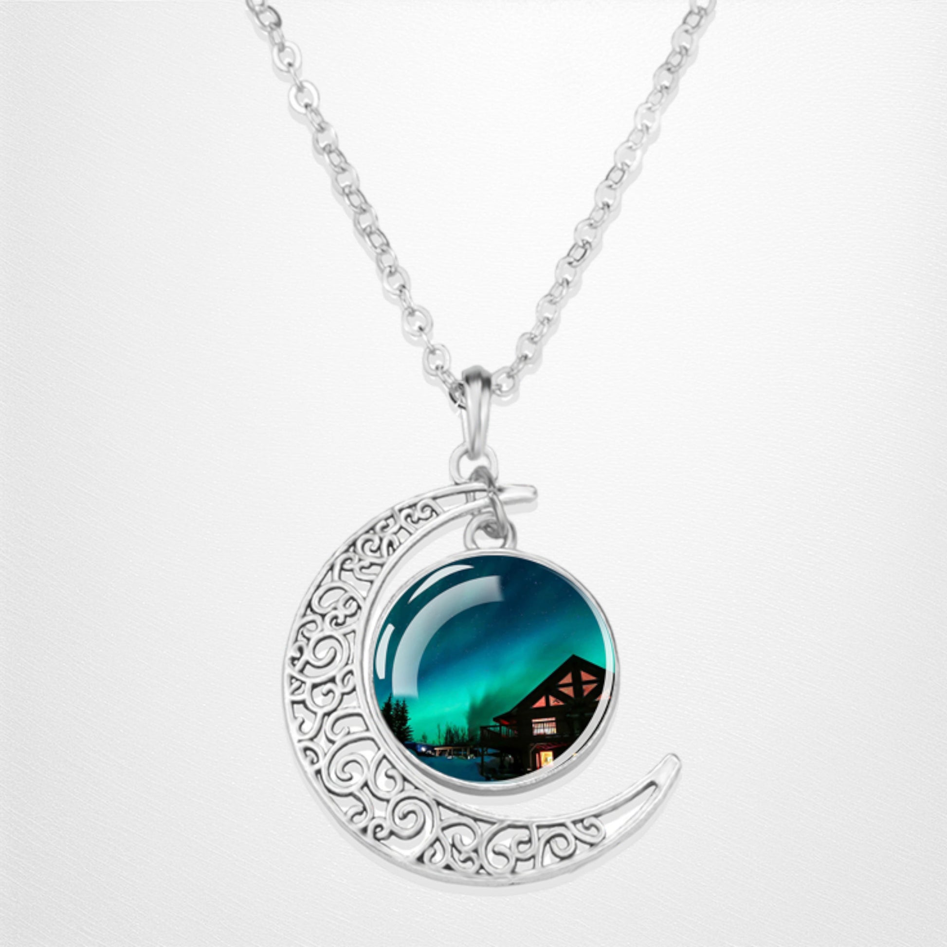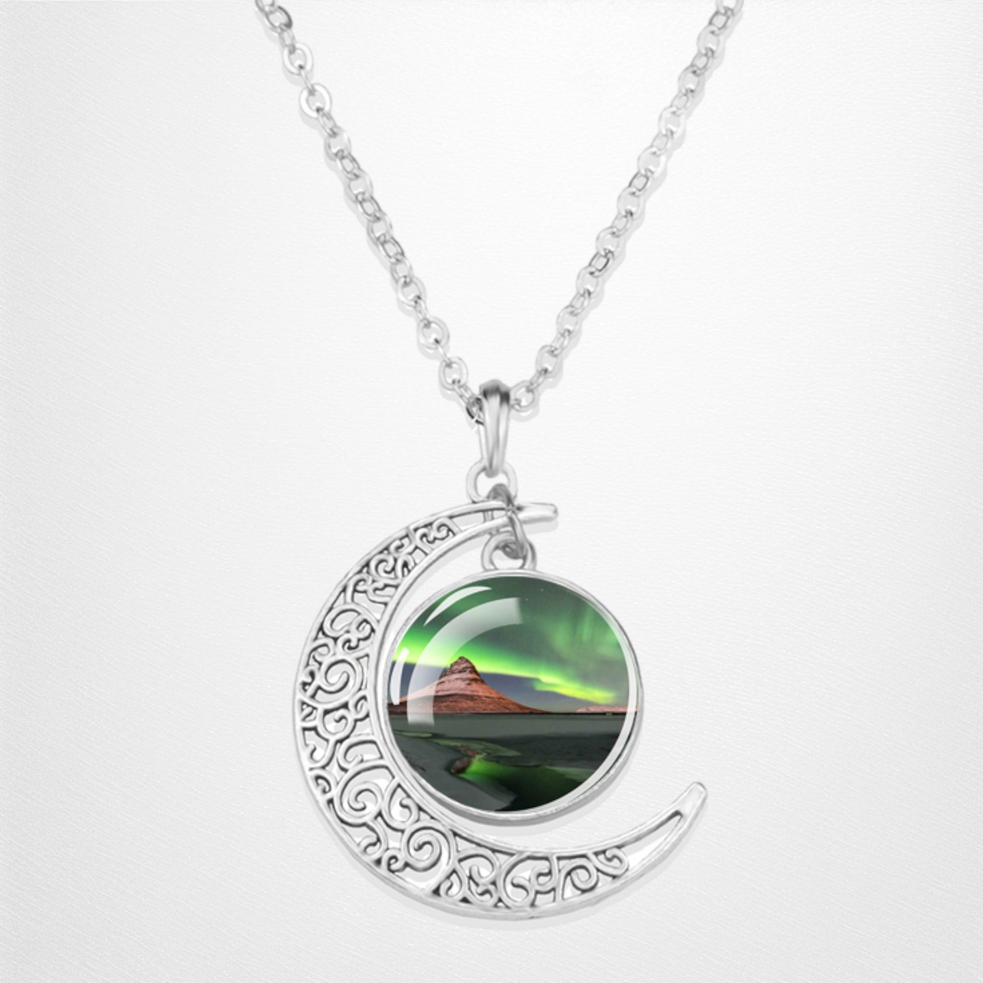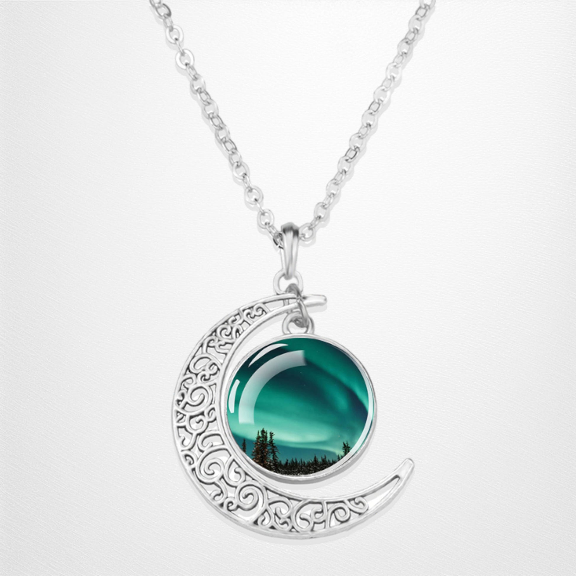 Adorn your neckline with the celestial charm of the Luminous Aurora Borealis Crescent Necklace. This exquisite piece of Northern Light Jewelry encapsulates the ethereal allure of the auroras in a Crescent Glass Cabochon pendant, making it the perfect gift for Aurora lovers.