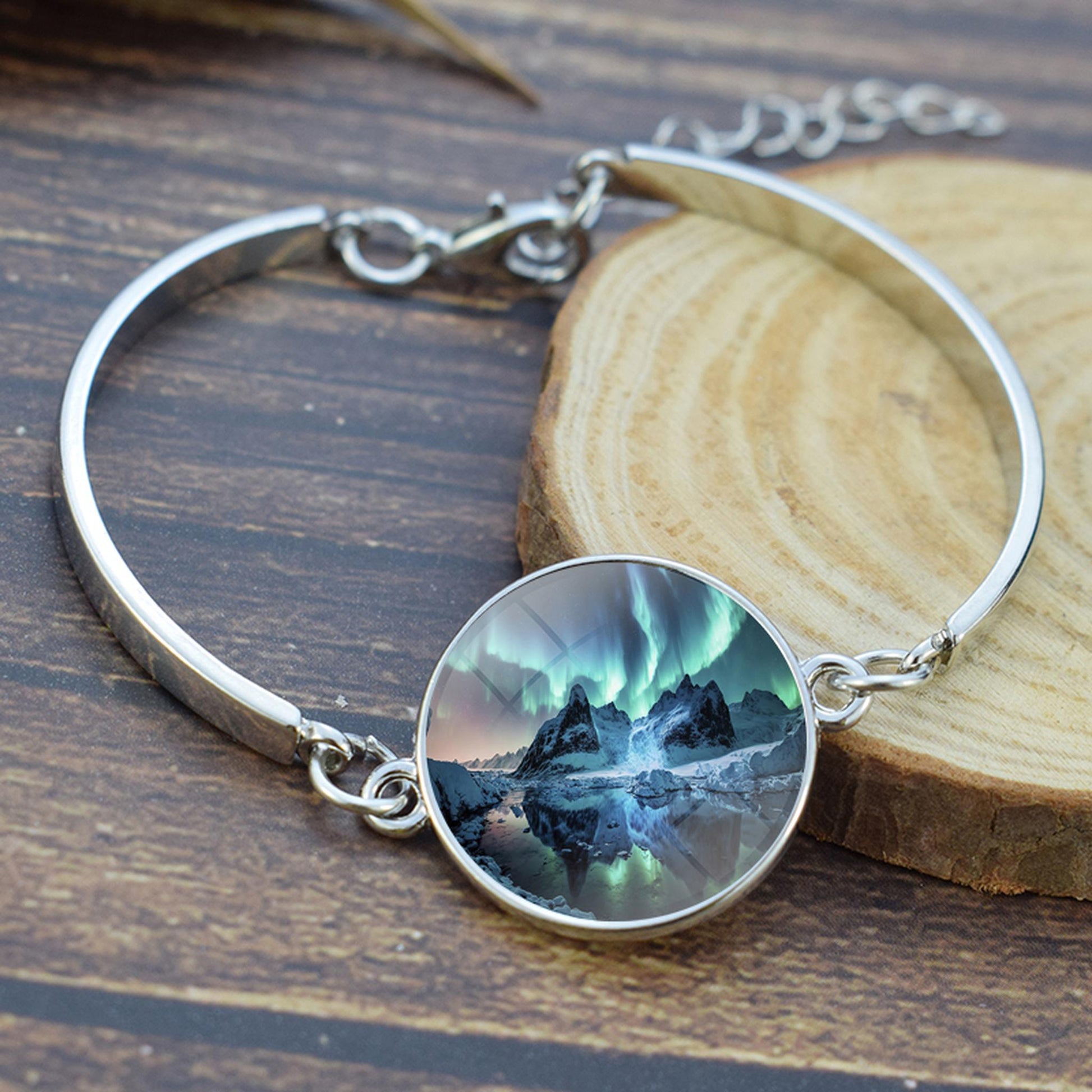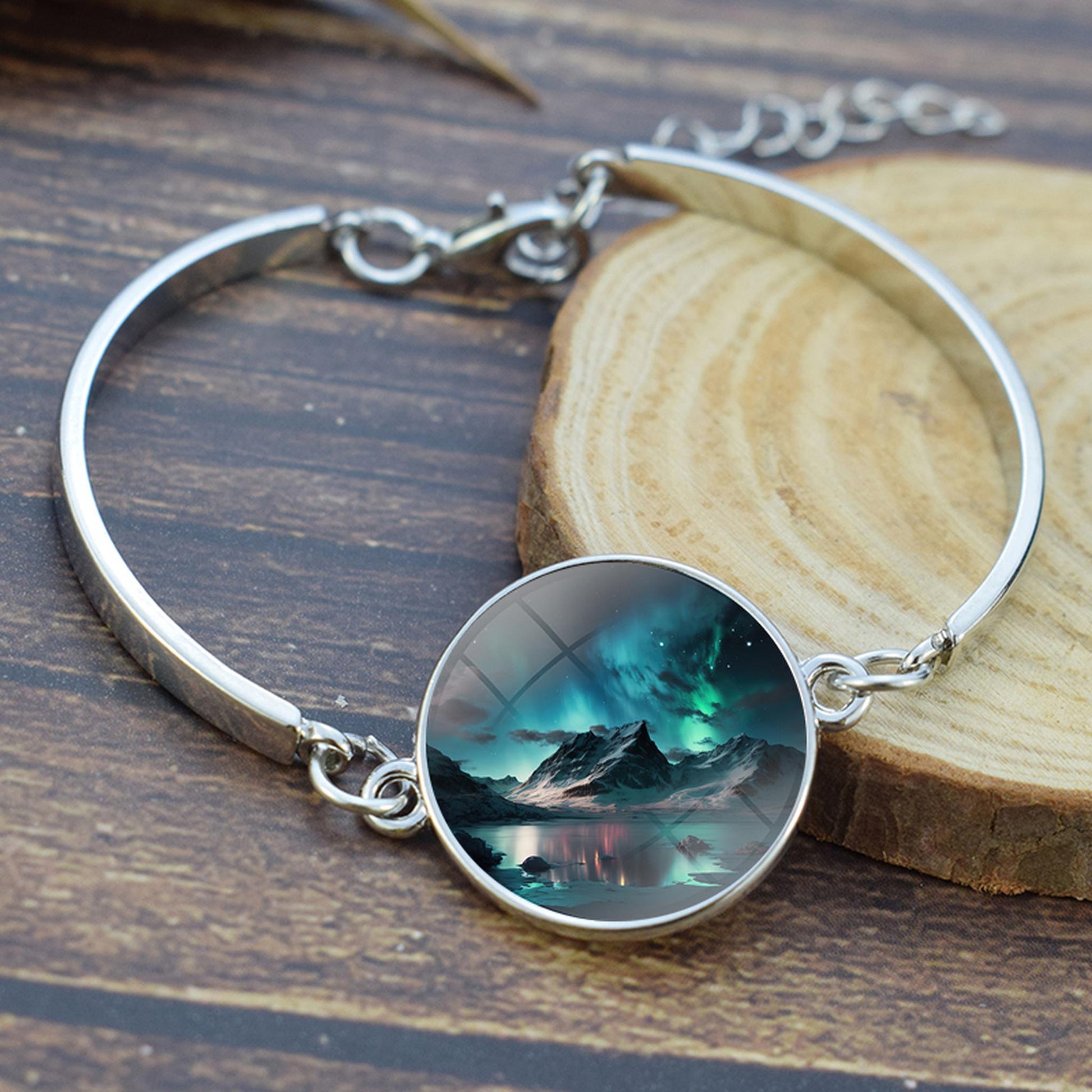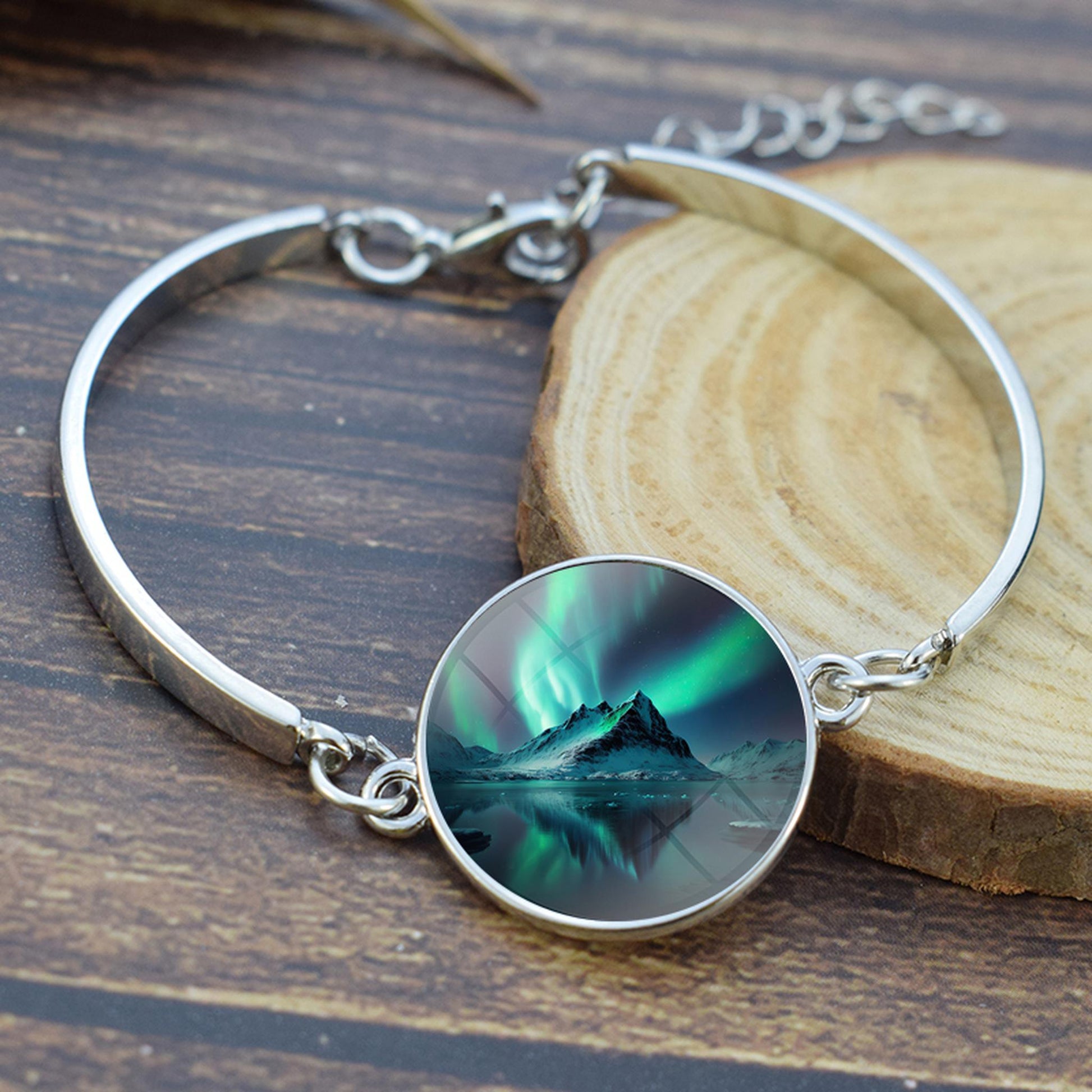 Ljusande Aurora Borealis armband - Northern Light Smycken - Unikt Cabochon Silver Pläterat armband av glas - Perfekt Aurora Lovers Present